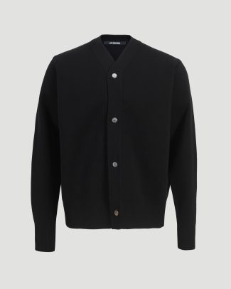 Black V-neck cardigan by Jacquemus featuring a front button closure and ribbed cuffs and hem.