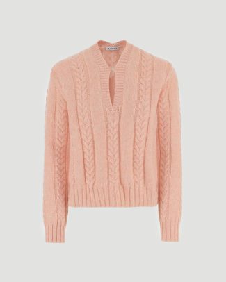 Medium-weight textured wool mouliné sweater by Loewe, featuring a V-neck with engraved Anagram fastening. Designed with ribbed collar, cuffs, and hem for structure and comfort, and finished with an Anagram leather tab at the side for a signature touch.