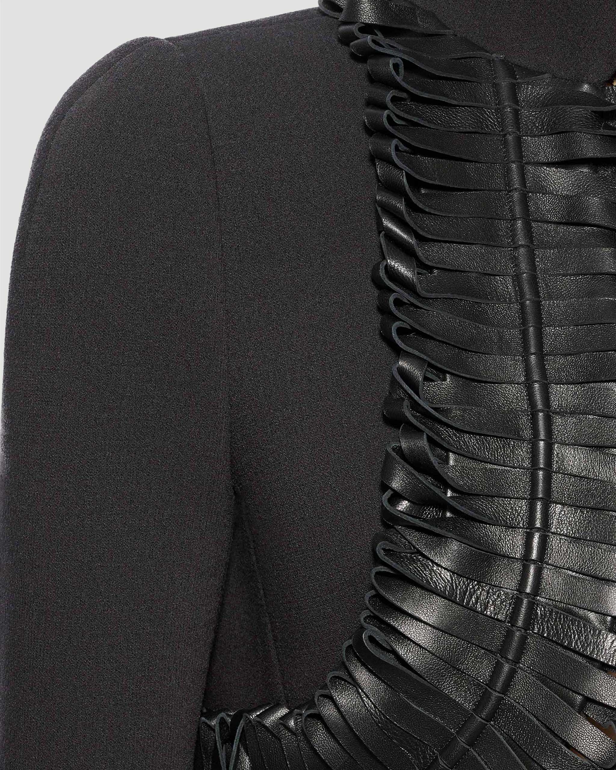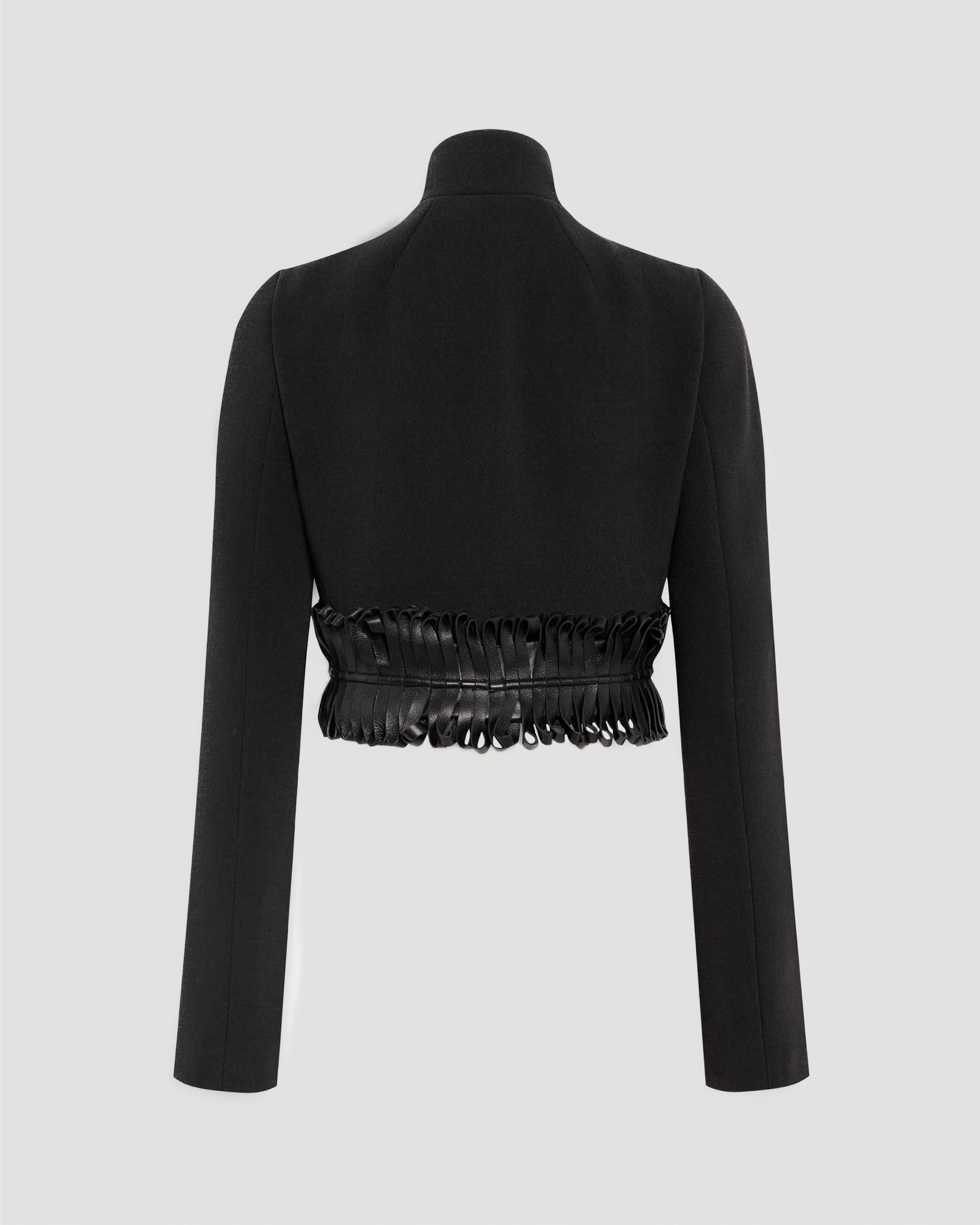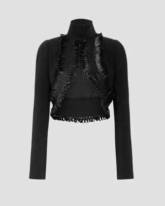 Cropped fitted jacket by Alaïa, crafted from double-face wool. Features a high neck, long sleeves, and a front triangular opening. Finished with curled leather trimming details that accentuate the silhouette.