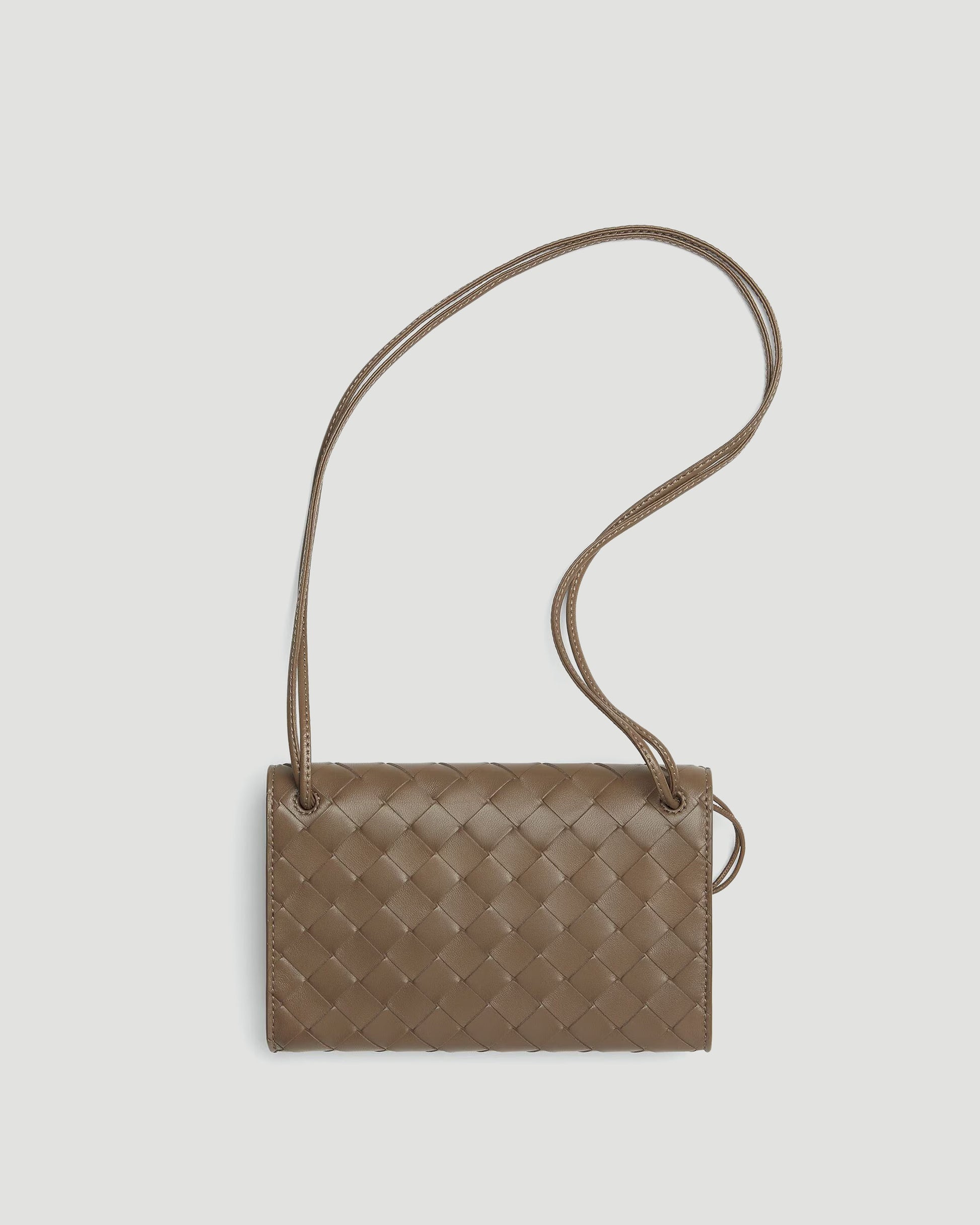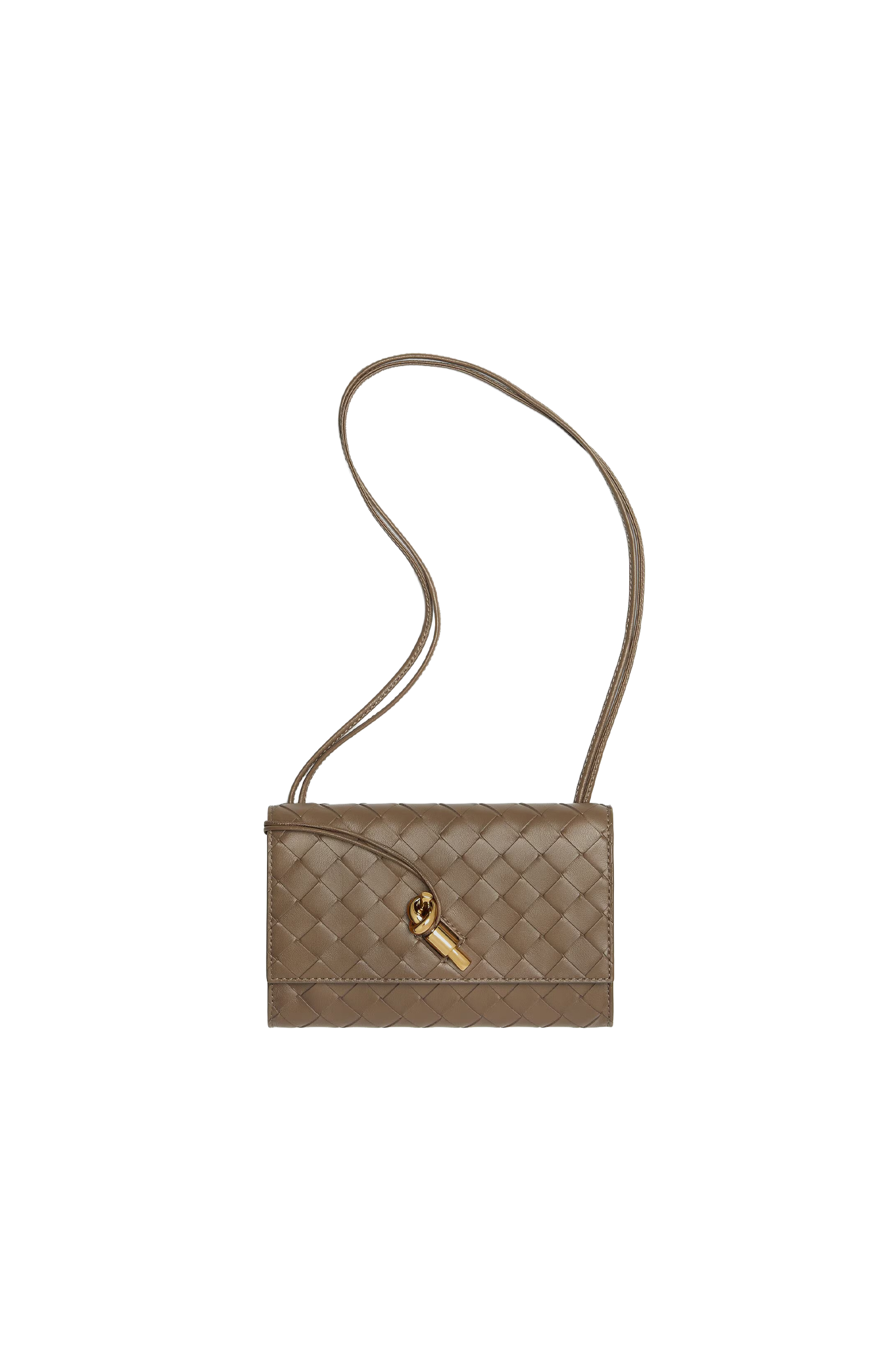 This pouch by Bottega Veneta is crafted from supple Intrecciato nappa leather and features the house’s iconic metallic knot closure. Designed with a minimalist silhouette, it includes one main compartment, two interior card slots, and a sliding leather strap for versatile styling—merging timeless craftsmanship with modern elegance.