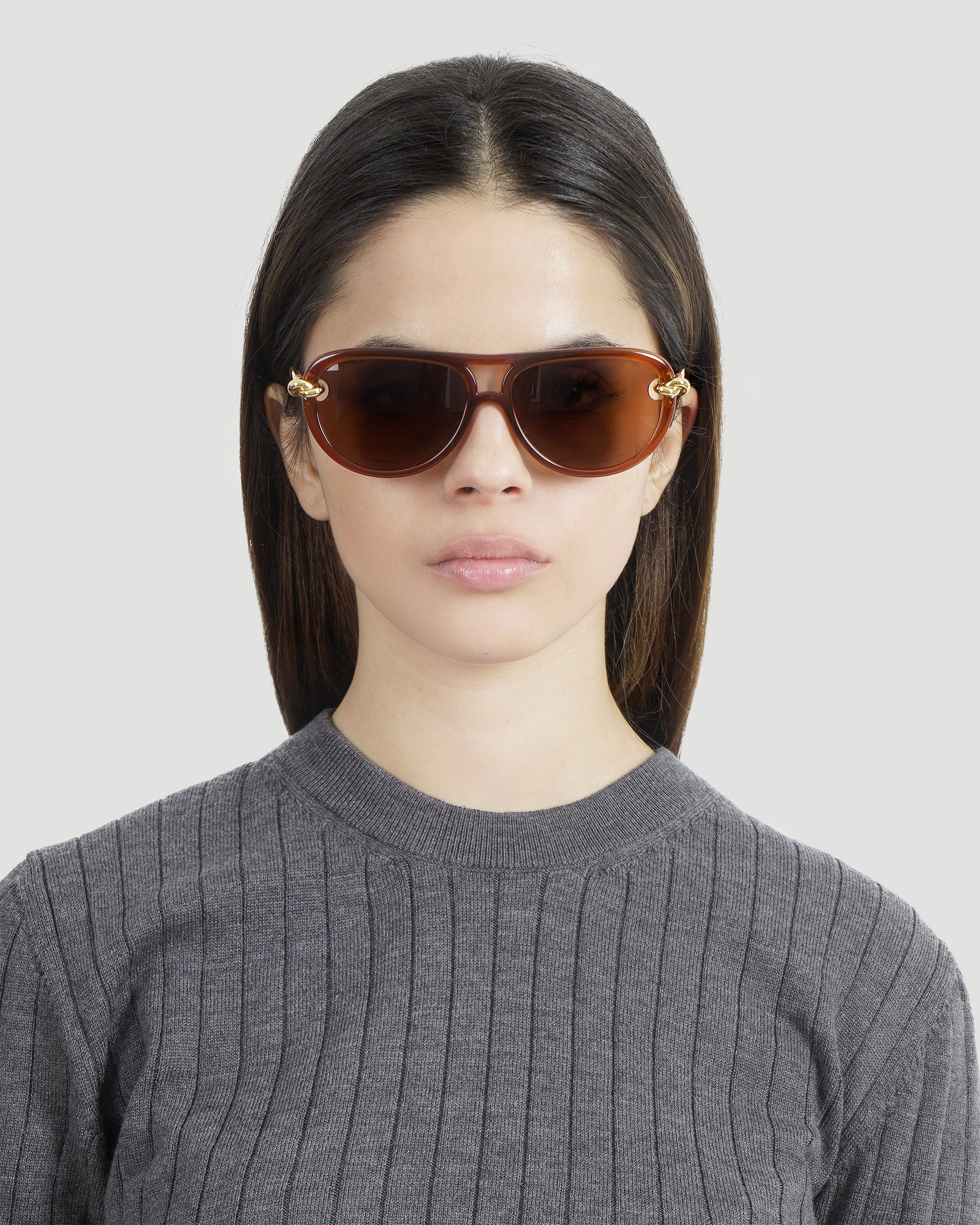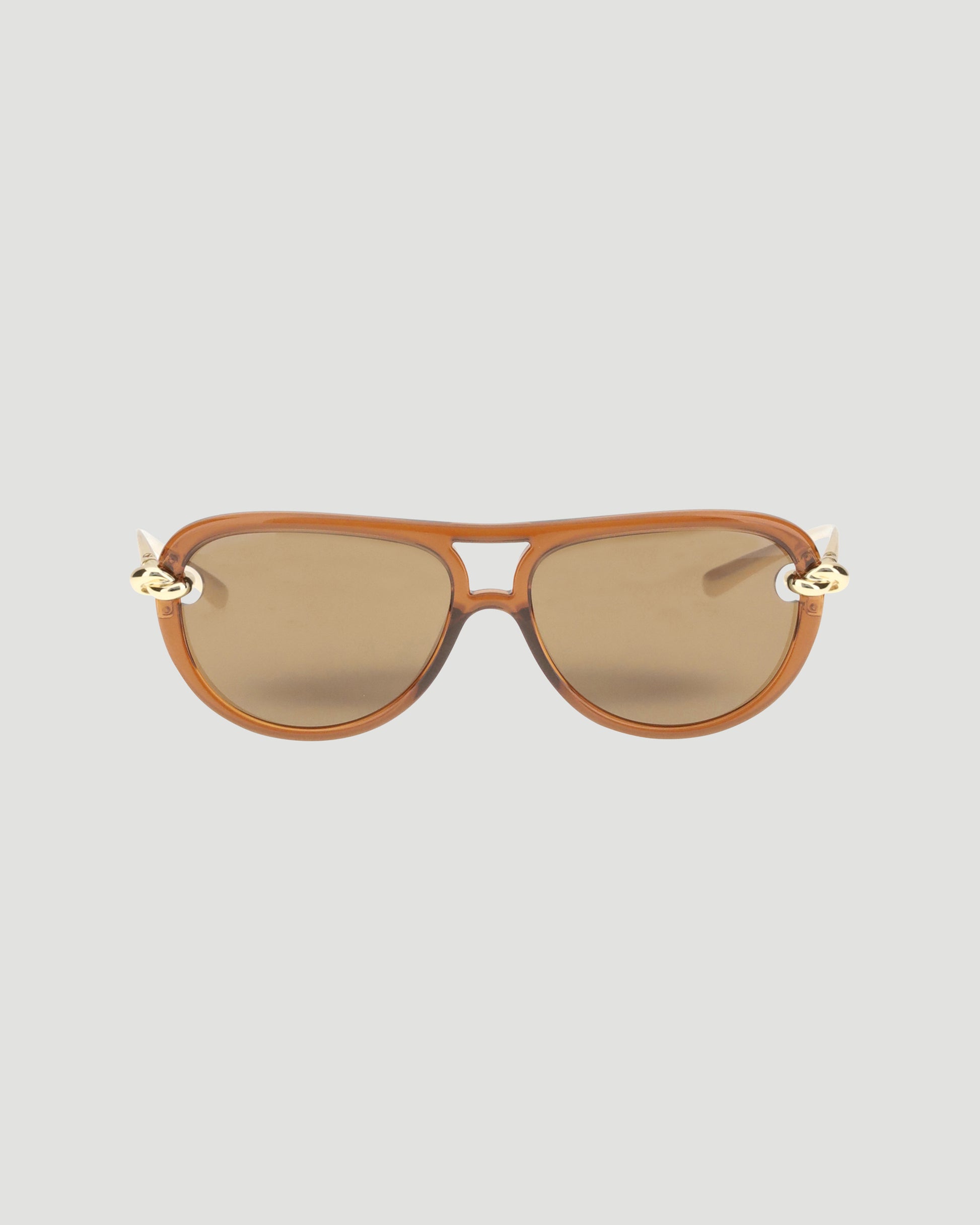 These sunglasses by Bottega Veneta feature a brown pilot frame paired with gold-tone metal temples accented by knot detailing. Finished with tinted lenses and adjustable nose pads for a comfortable fit.