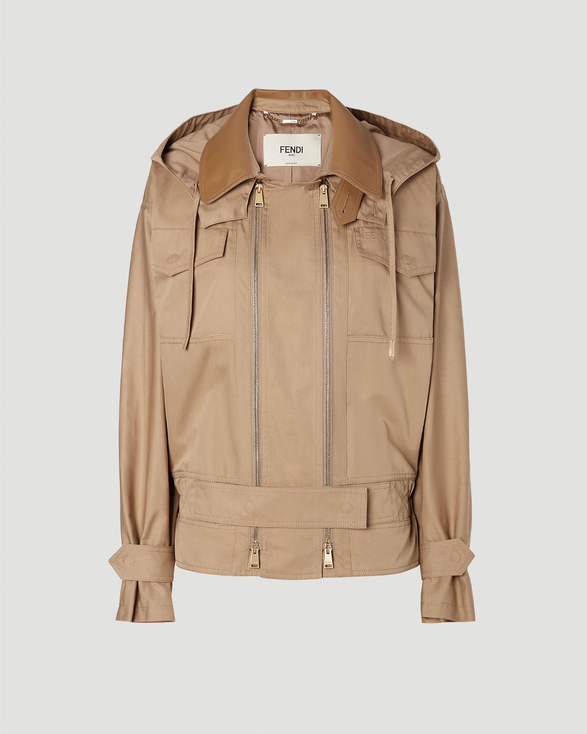 This blouson from Fendi is crafted in Italy from beige cotton drill with two parallel full-length zips and a front martingale. It features a shirt collar with a detachable drawstring hood, low-set sleeves with cuff straps, and chest and side pockets. Finished with tone-on-tone detailing, a leather undercollar, an embroidered Fendi logo, and palladium-tone metalware.