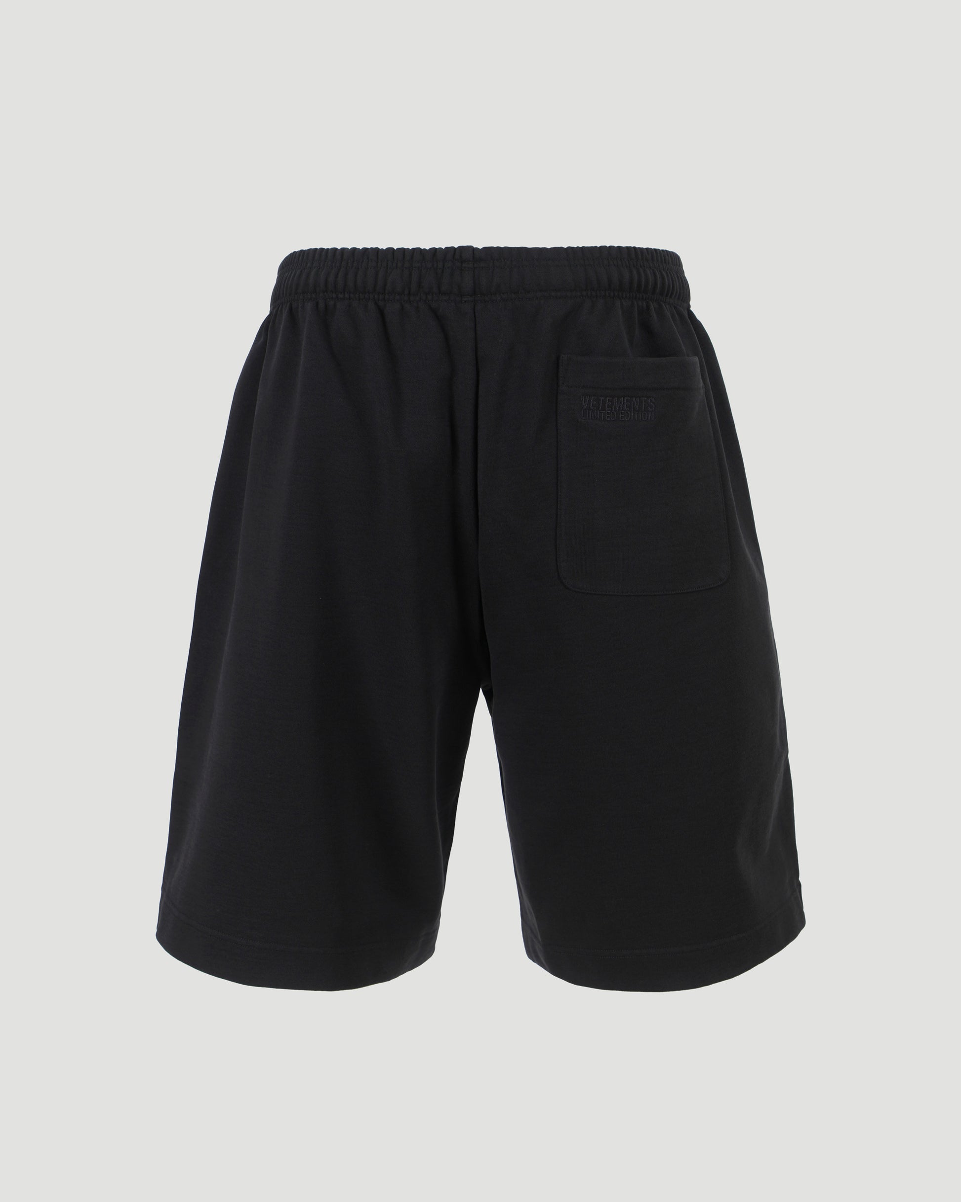 These black shorts by Vetements feature a relaxed fit and are designed with an elasticated waistband for comfort, side pockets for functionality, and a single back pocket for added detail. Ideal for casual wear.