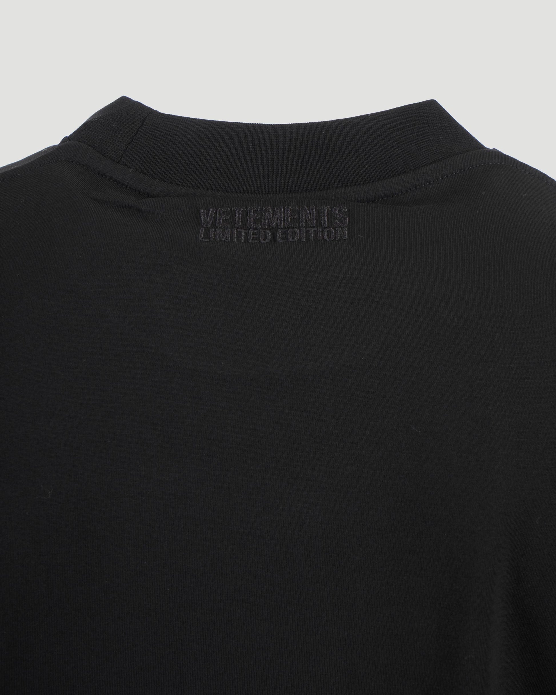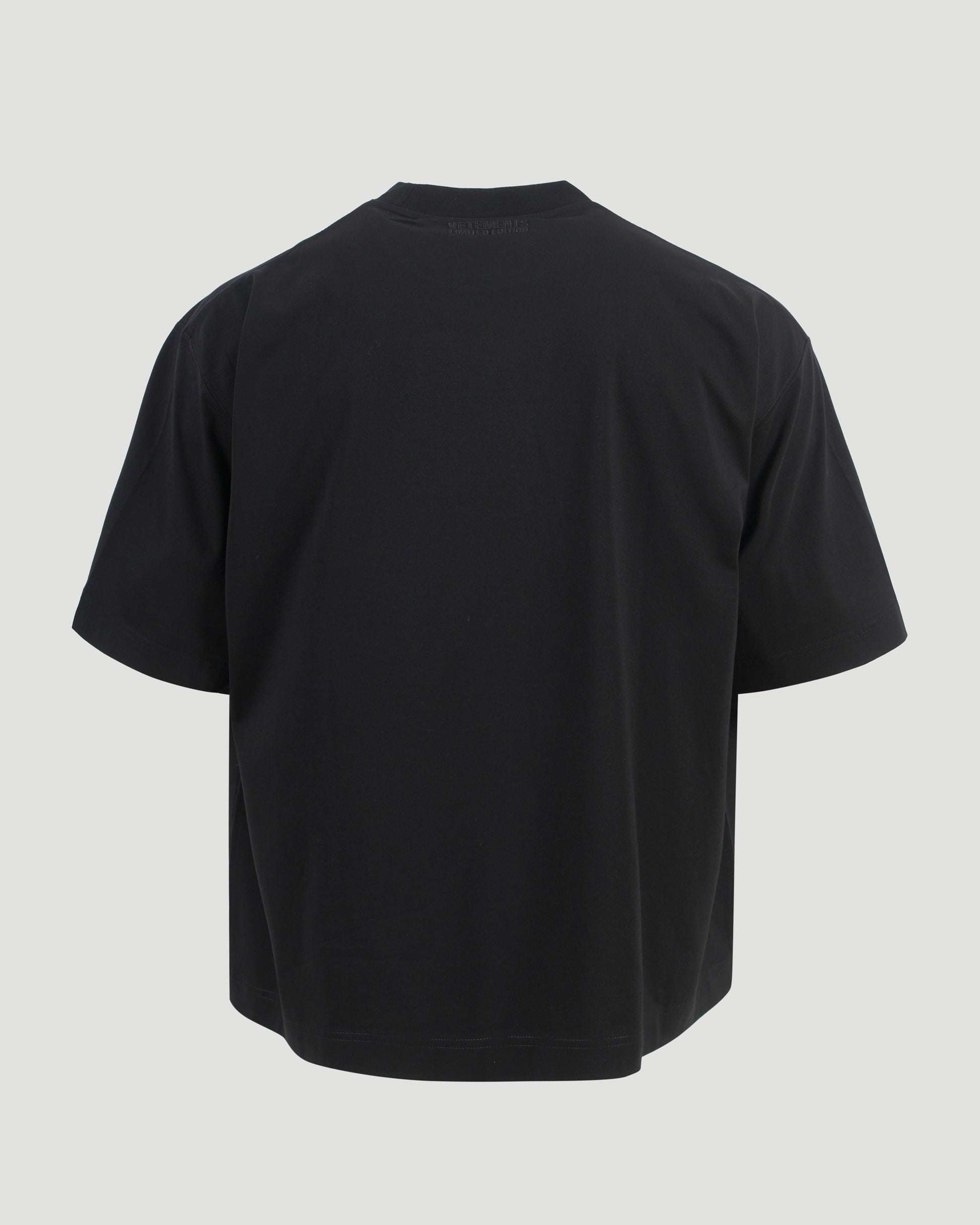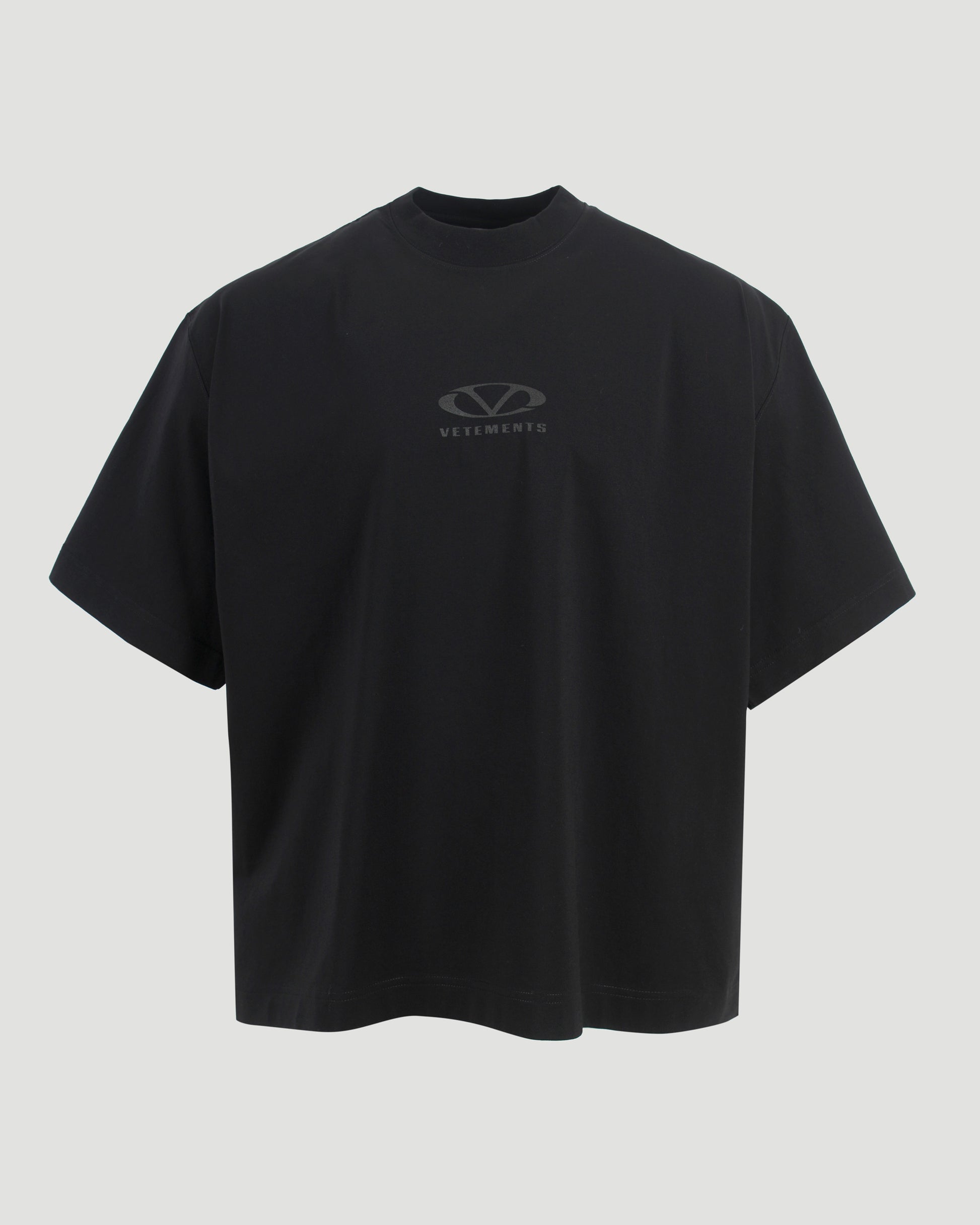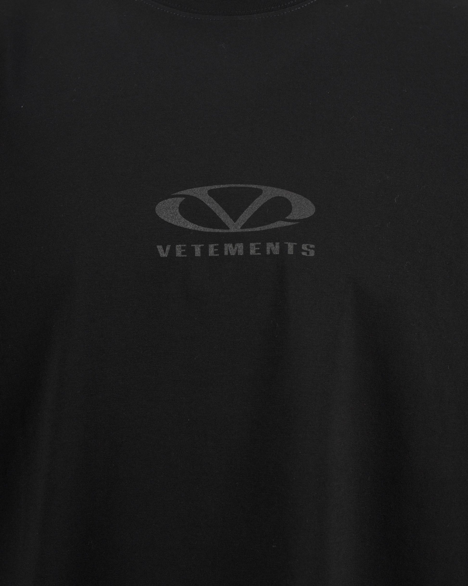 This black short-sleeved T-shirt by Vetements is a perfect blend of comfort and style. It features a relaxed fit and a classic round neckline for a sleek silhouette. A grey Vetements logo at the chest adds a signature touch, making it a versatile piece for both casual and layered looks.