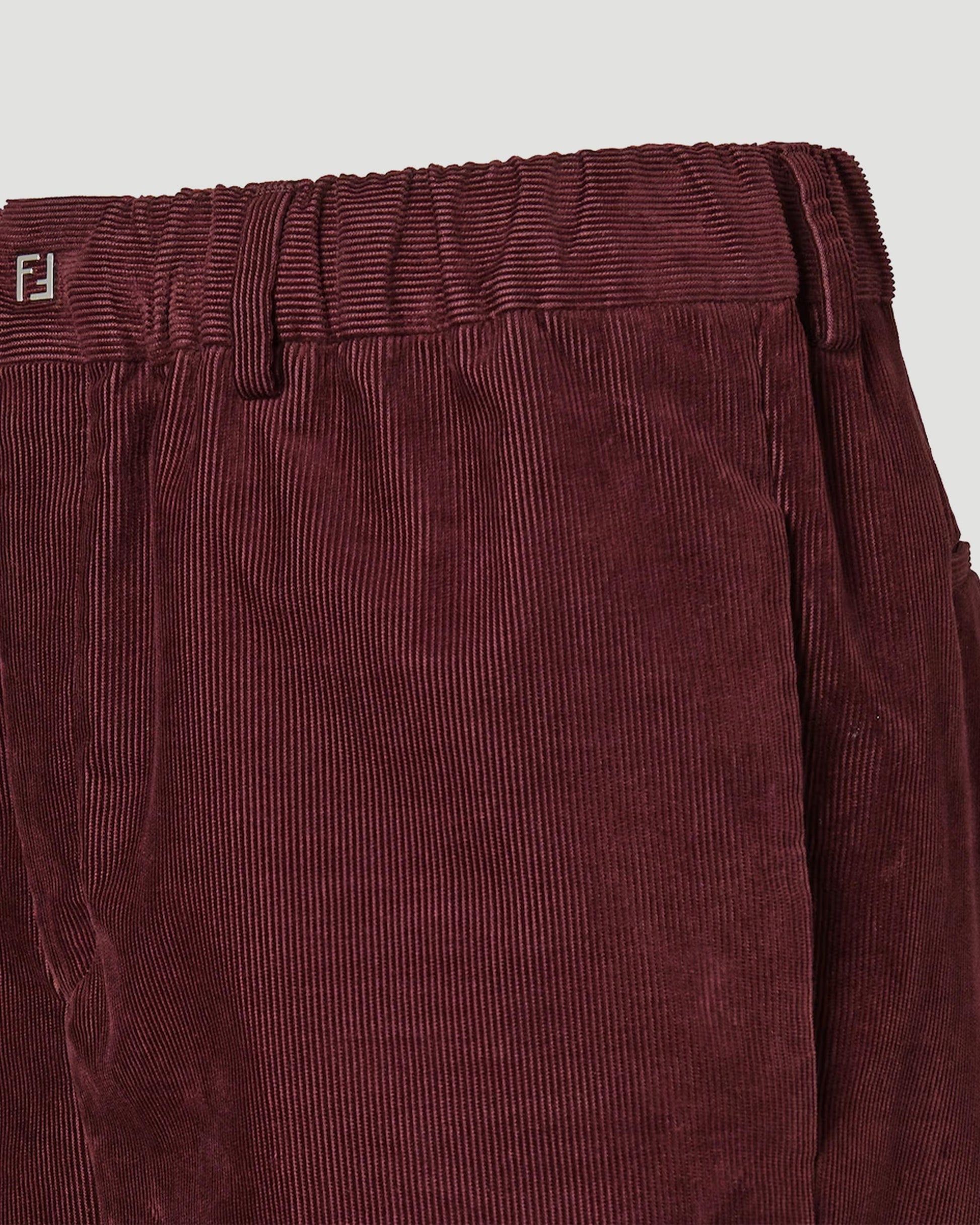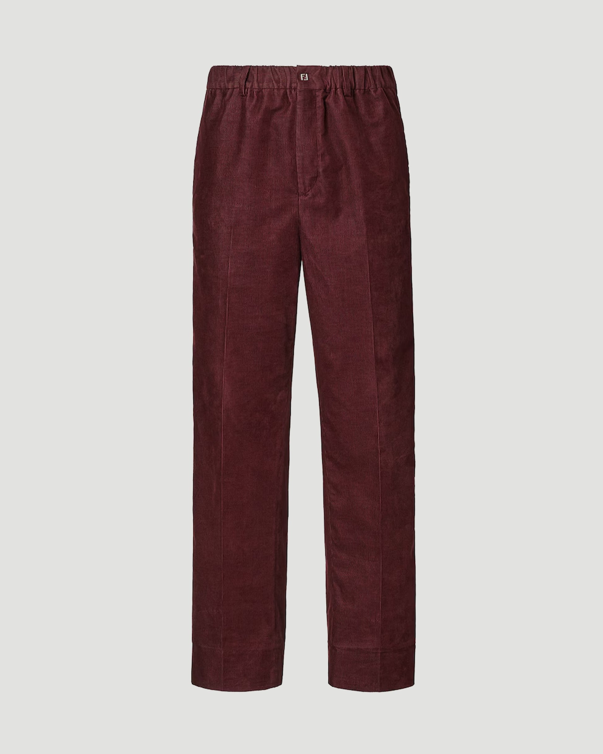 These straight trousers by Fendi are crafted in Italy from burgundy cotton corduroy and feature an elasticated waistband with belt loops, side pockets, and back welt pockets. They have a concealed zip-and-hook fastening, a pressed crease, and a 22 cm hem width. Finished with a micro FF logo button detail at the waist.