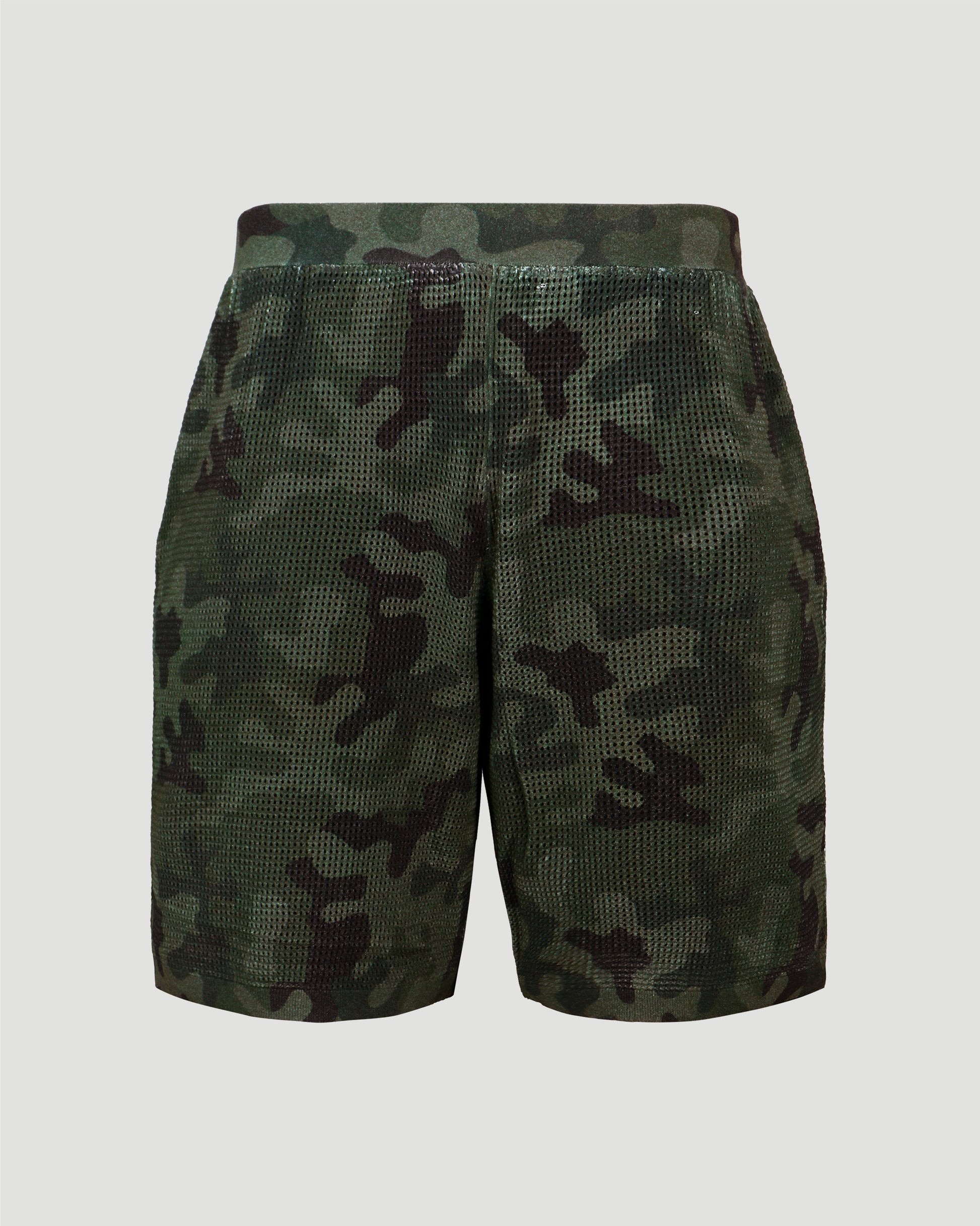 These shorts are perfect for a summer beach day. Made from a breezy open-knit fabric in an army green camo pattern, they feature an elasticated waistband and two front slit pockets.