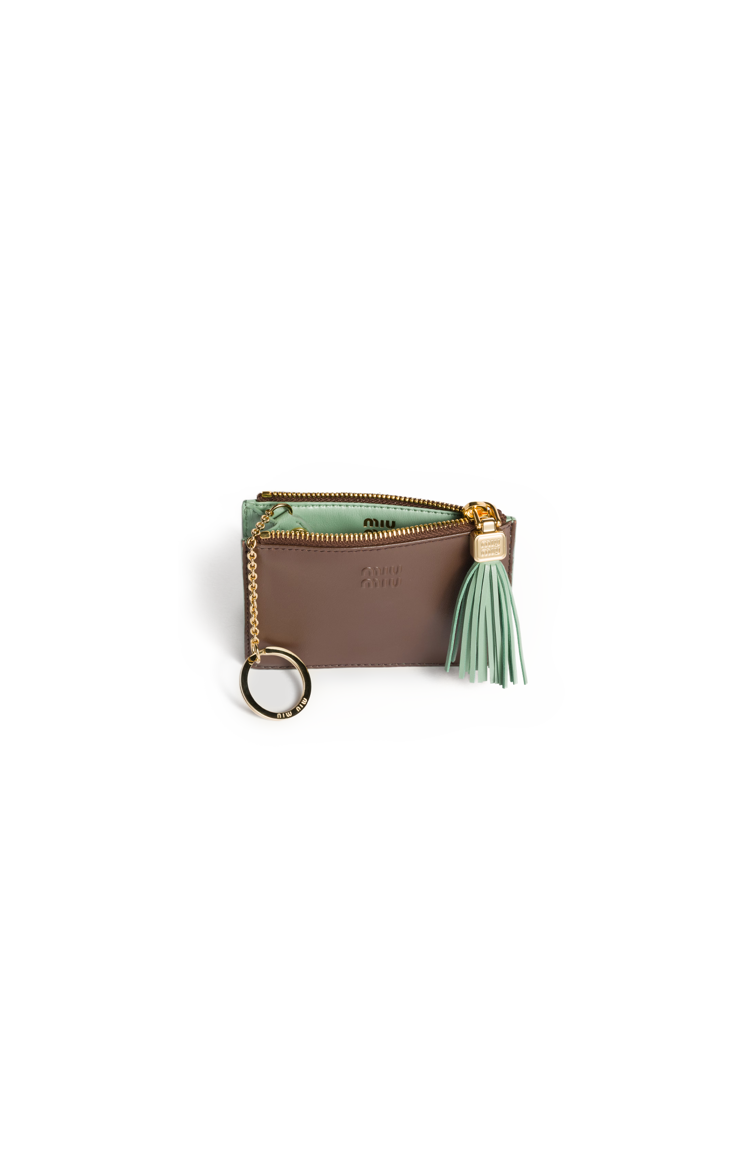 This card holder by Miu Miu is crafted in nappa leather with a compact silhouette. It features three card slots, a zip pocket with decorative pull, a removable metal keyring, moiré lining, and a raised Miu Miu logo.