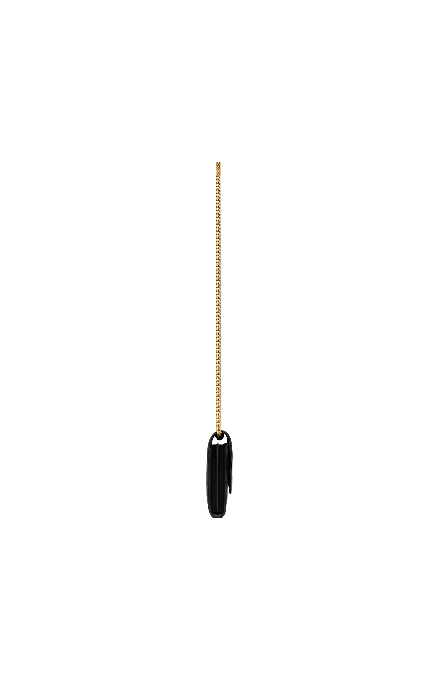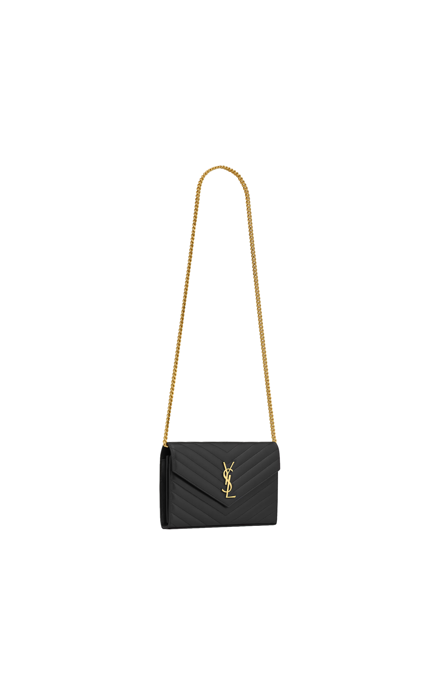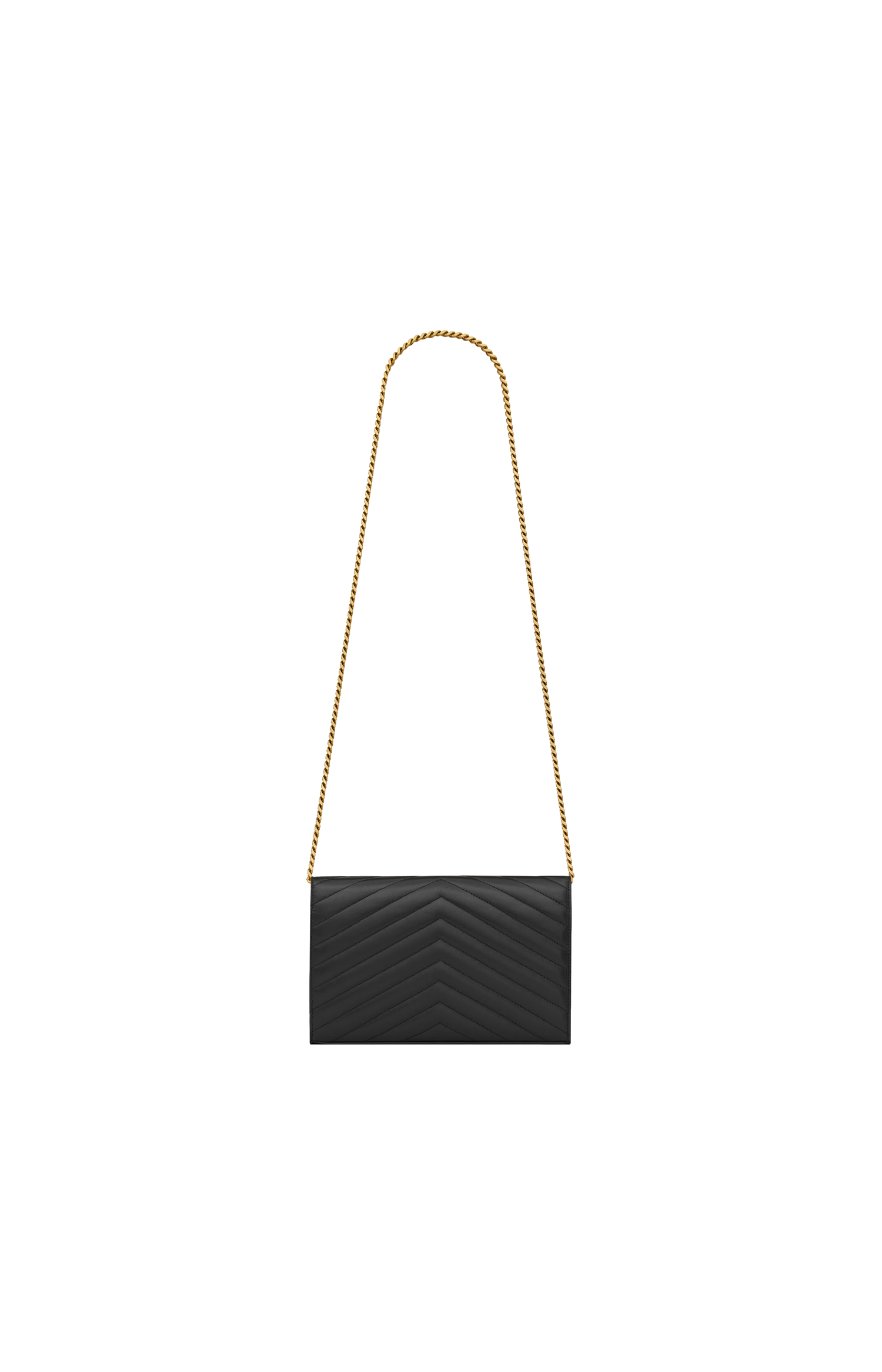 This chain purse by Saint Laurent is crafted in leather with chevron quilting and Cassandre embellishment. It features two central compartments, a zipped pocket, ten card slots, a bill slot, snap-button closure, and a detachable chain strap.