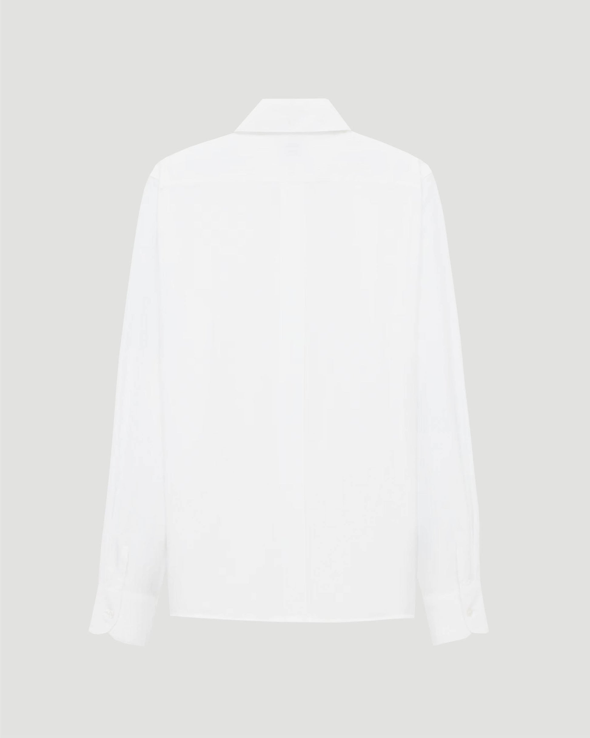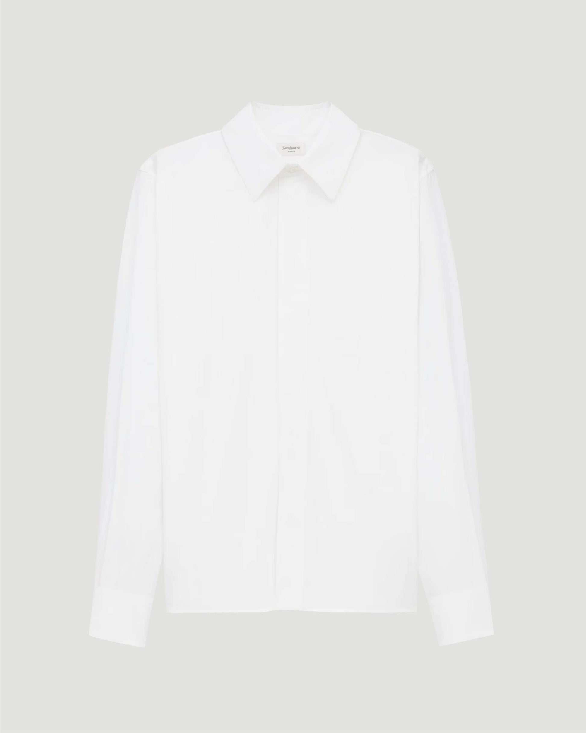 Buttoned shirt by Saint Laurent, crafted from certified cotton. Features a pointed collar, concealed front button closure, Cassandre embroidery at the hip, straight hem, and a back center box pleat.