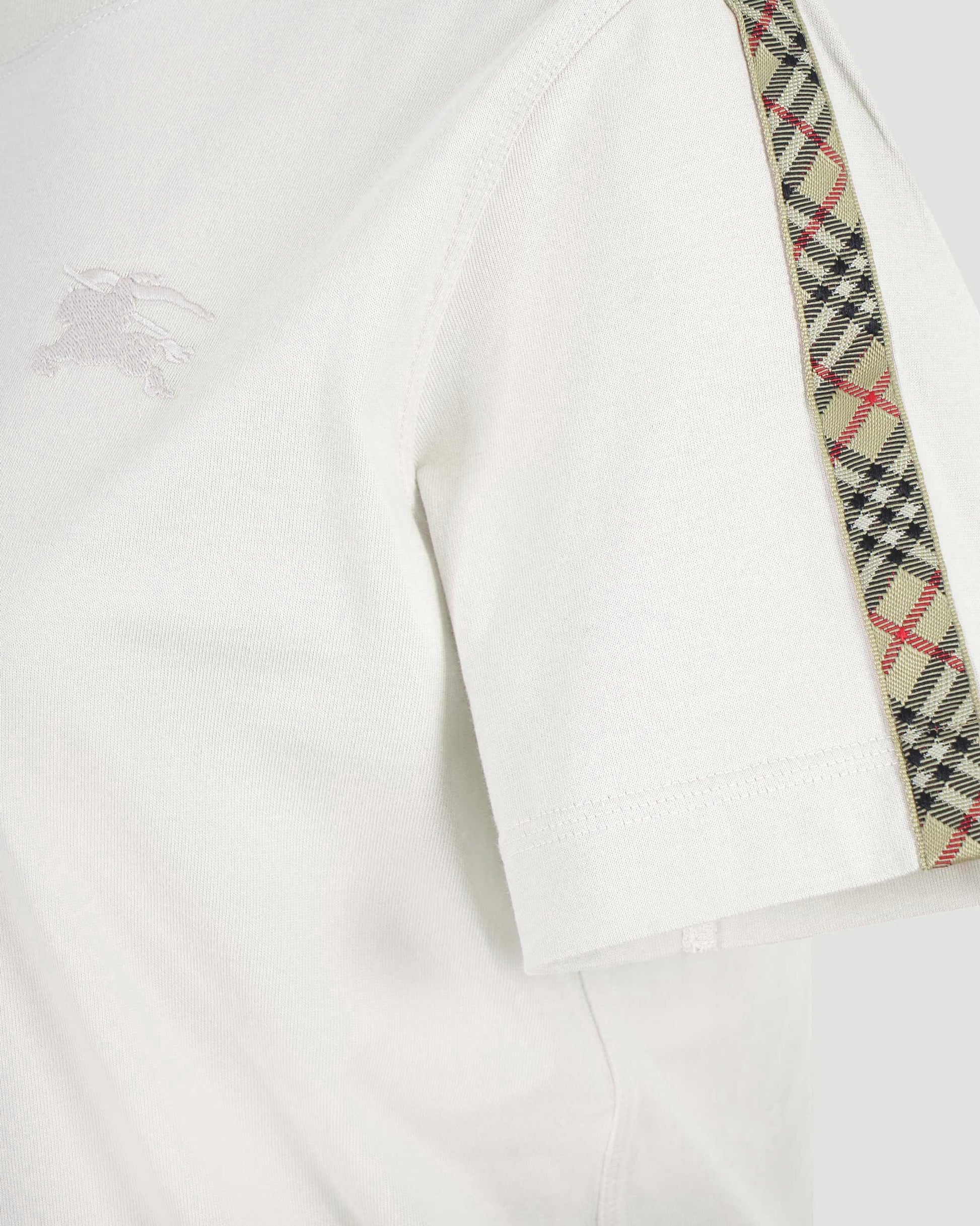 This crew-neck T-shirt by Burberry is crafted from cotton jersey and features Burberry Check taping at the shoulders in archive beige. Designed with a rib-knit neckline, back press-stud closure, and a tonal embroidered Equestrian Knight Design at the chest.