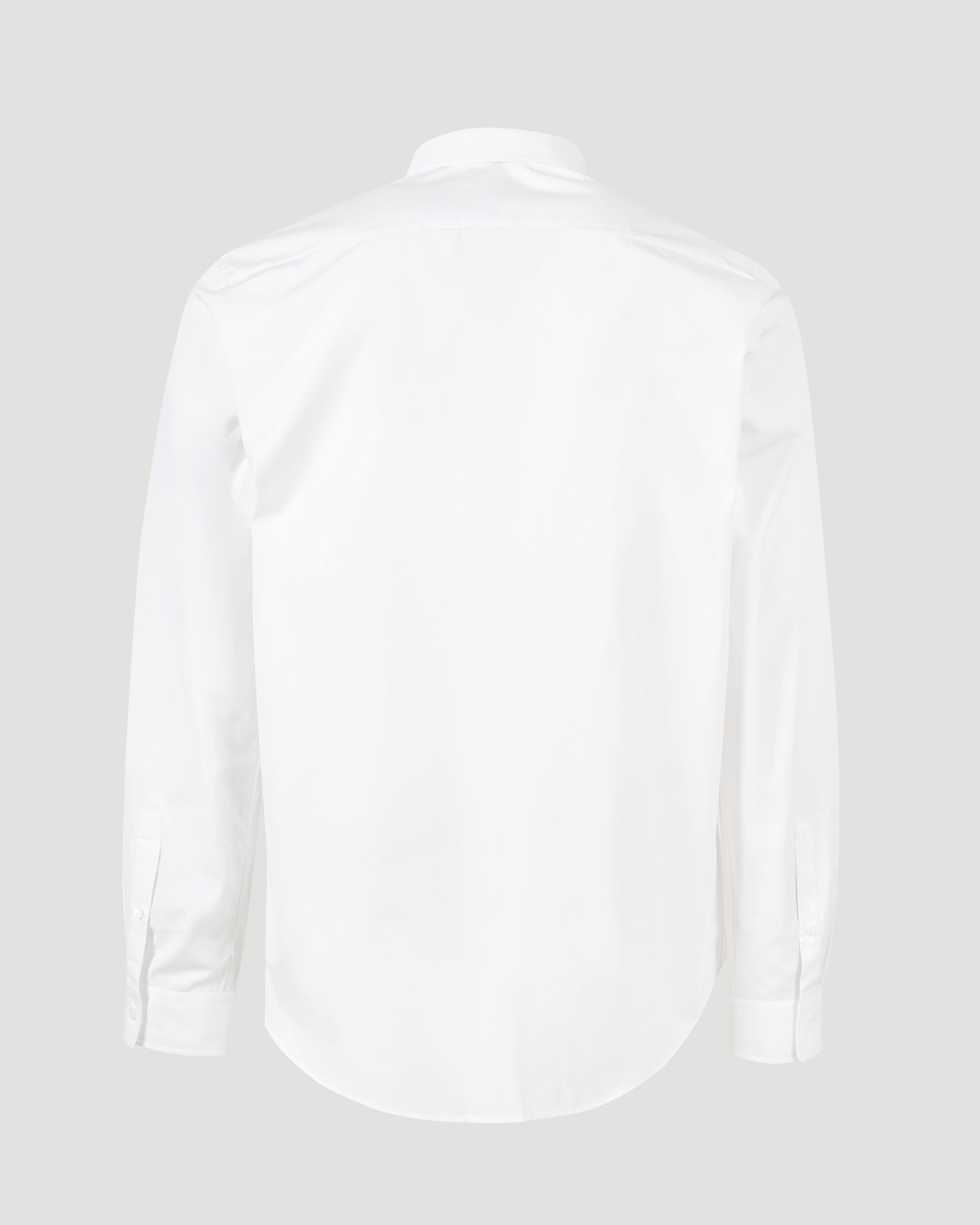 A classic white shirt from Burberry. Crafted in heavy cotton poplin, this formal style is embellished with the Equestrian Knight Design embroidery in blue at the side. Featuring long sleeves, a front button closure, a point collar, a curved hem, and a slim fit.
