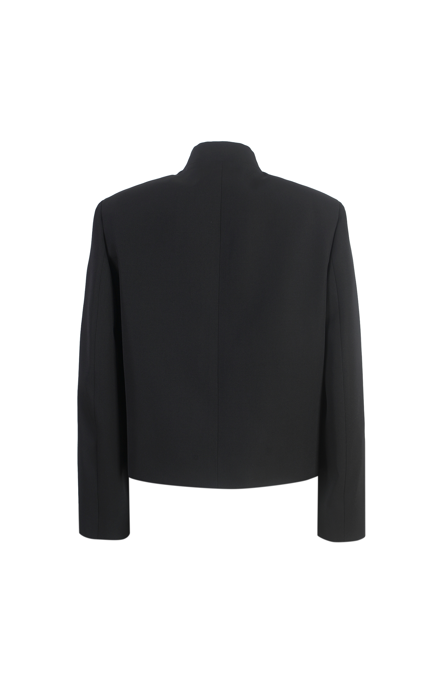 This wool jacket by Jil Sander is crafted from smooth wool with an asymmetric profile. It features a stand collar, padded shoulders, and a single-button closure.
