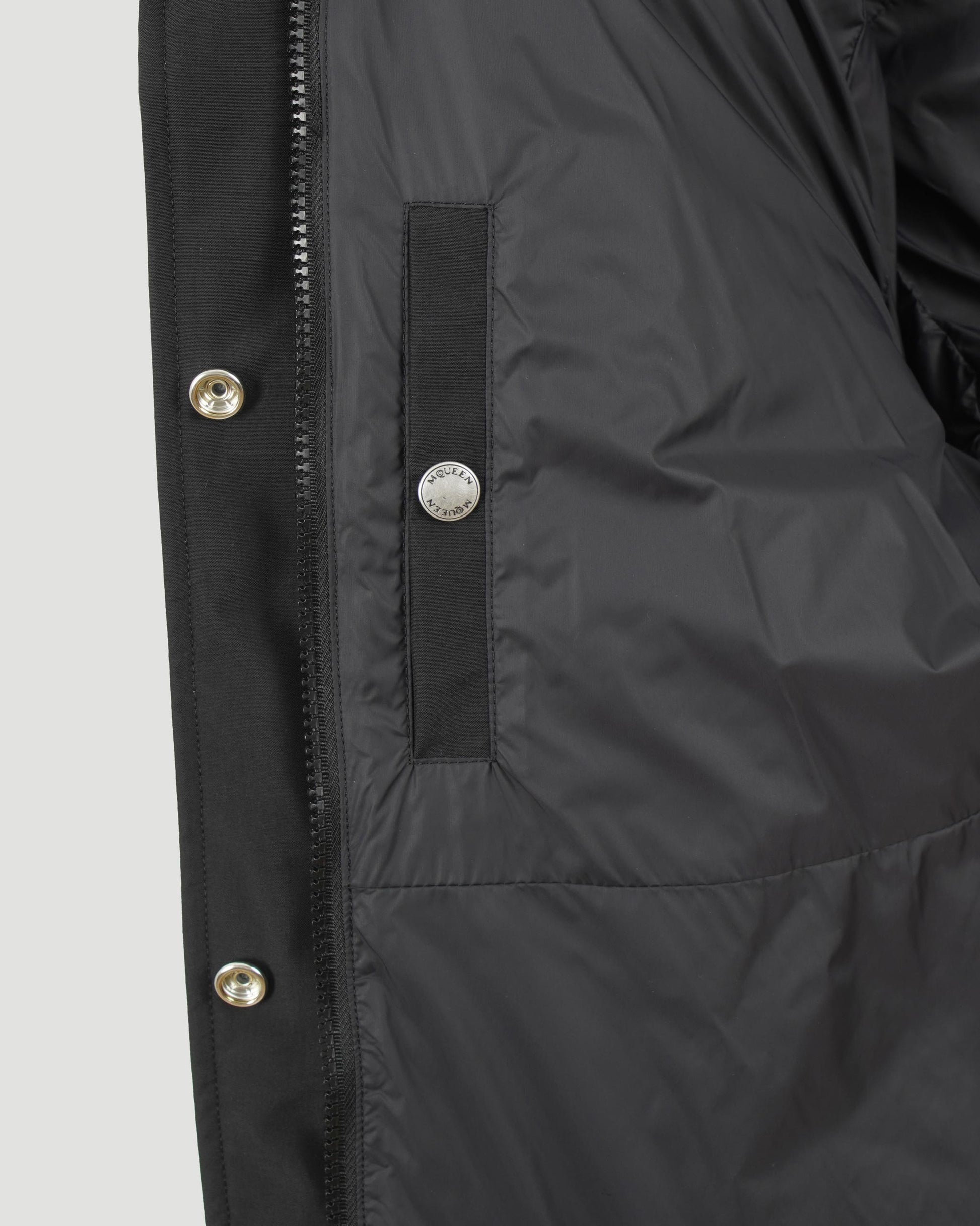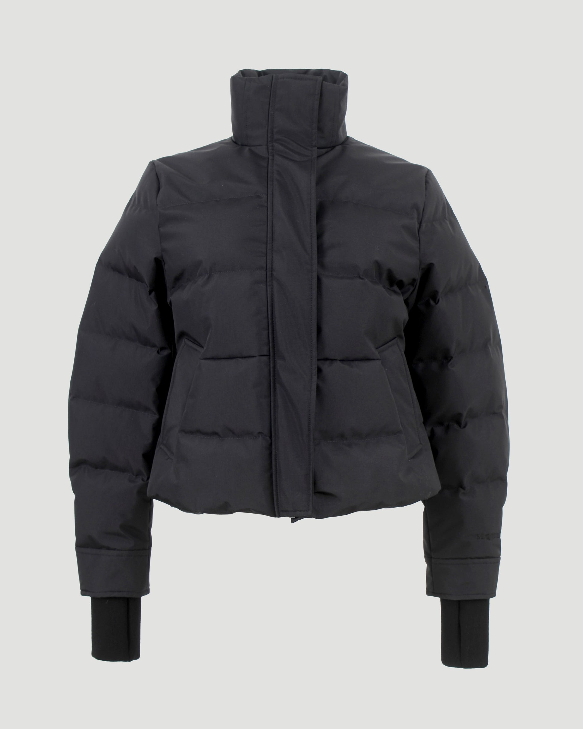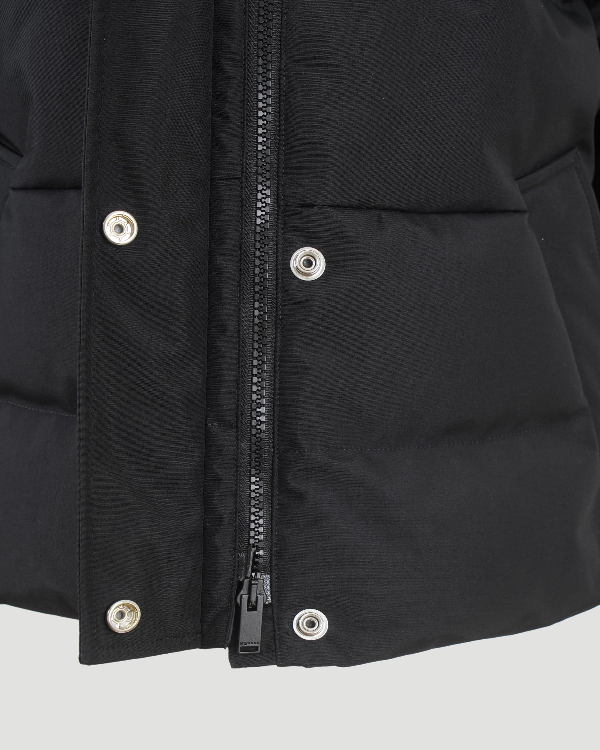 Cropped down jacket by Alexander McQueen in quilted technical fabric, padded with goose feathers. Designed with a cinched waist, standing collar, and front zip with snap button closure. Features side pockets and long sleeves finished with knitted cuffs.