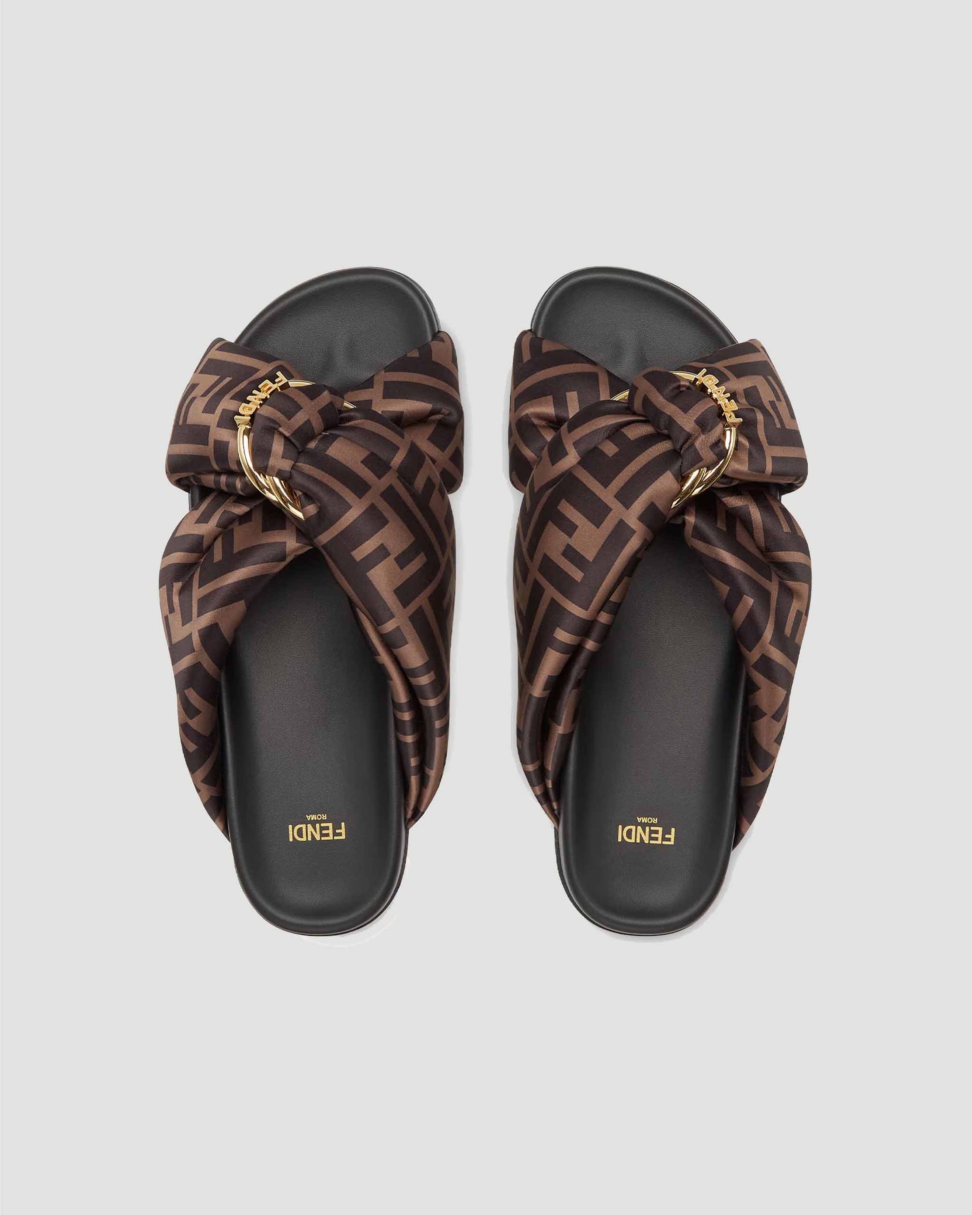 These padded double-band flat slides by Fendi blend luxury with comfort. Crafted from satin featuring the iconic FF motif in shades of brown, they are accented with a decorative D-ring buckle showcasing three-dimensional Fendi lettering. A black leather insole and edges add refinement, while gold-finish metalware completes the elegant design.