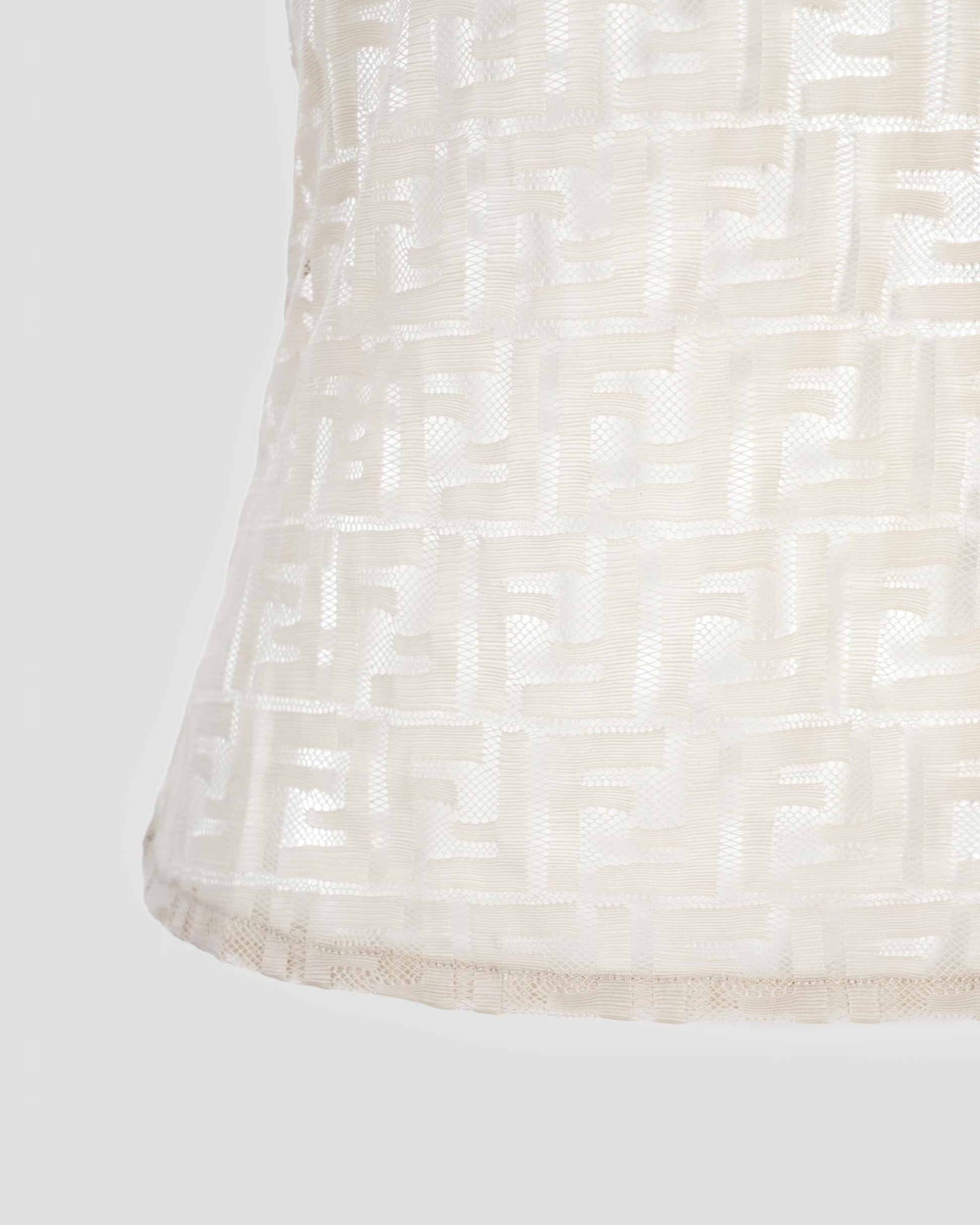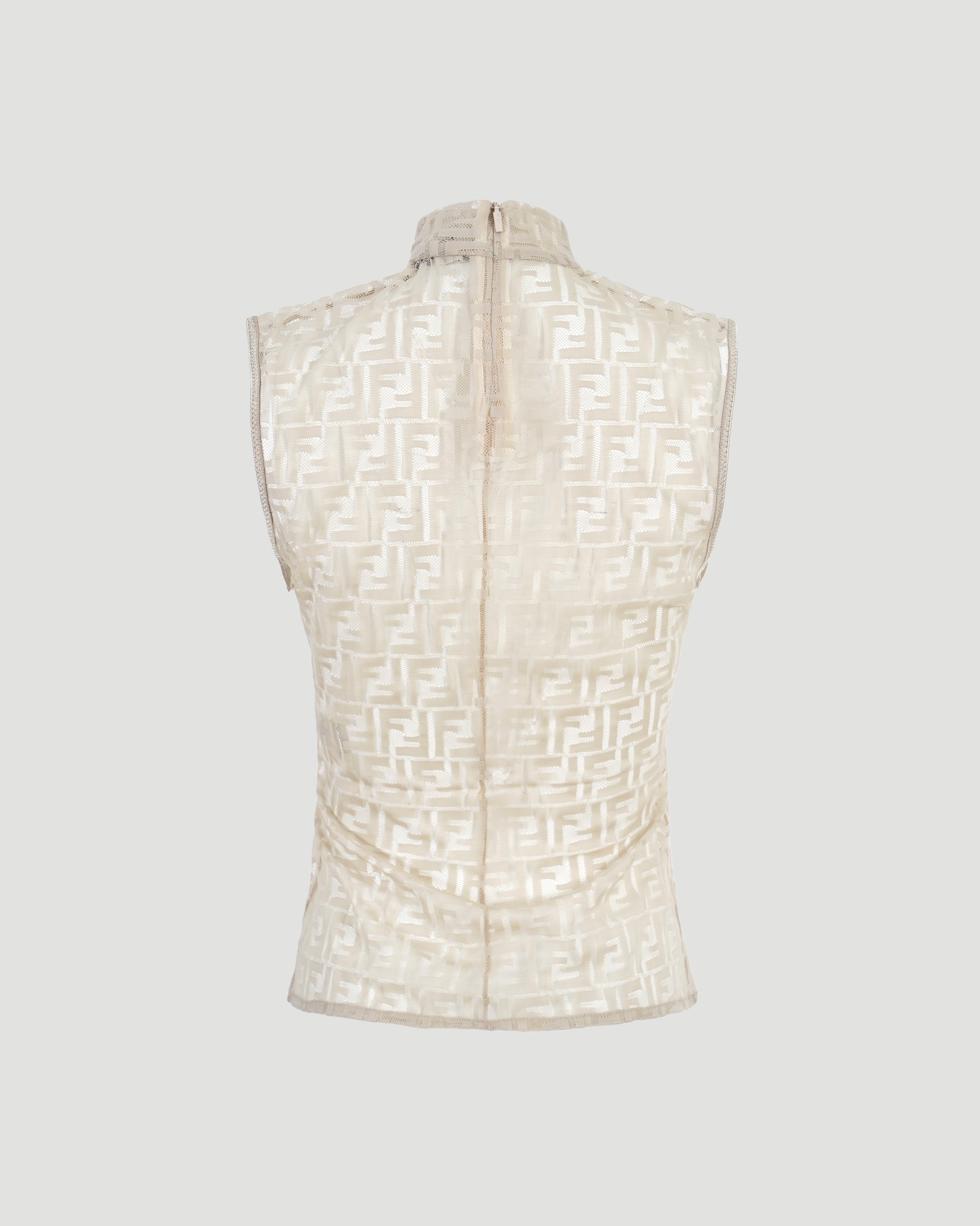 This sleeveless top by Fendi is crafted in beige fabric featuring an all-over FF logo pattern. Designed with a high neck and front zip fastening.