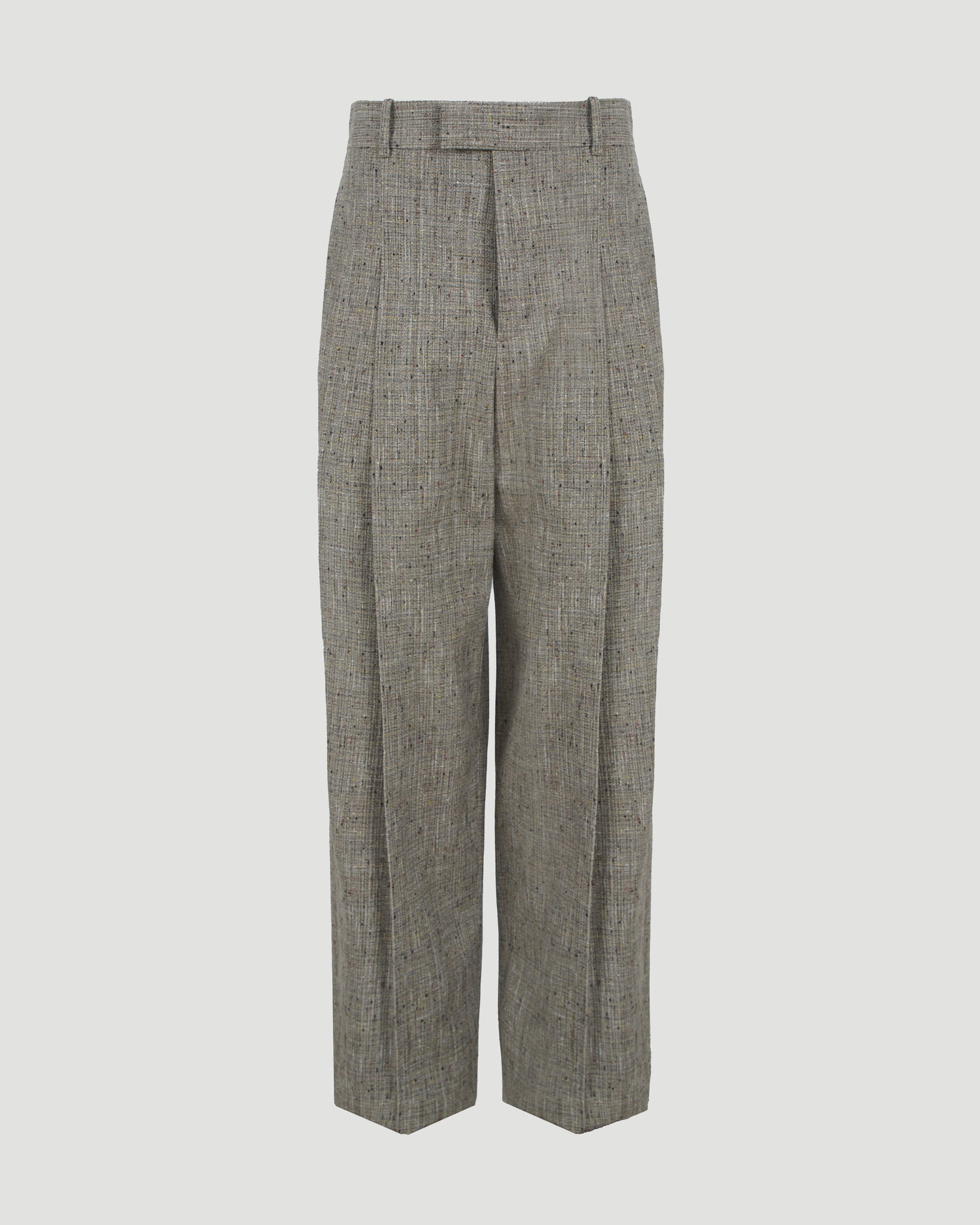 These pleated trousers by Bottega Veneta are crafted from multicolour flecked viscose and designed with a straight leg and mid-waist fit. They feature a zip, hook, and button closure for a clean, tailored finish.