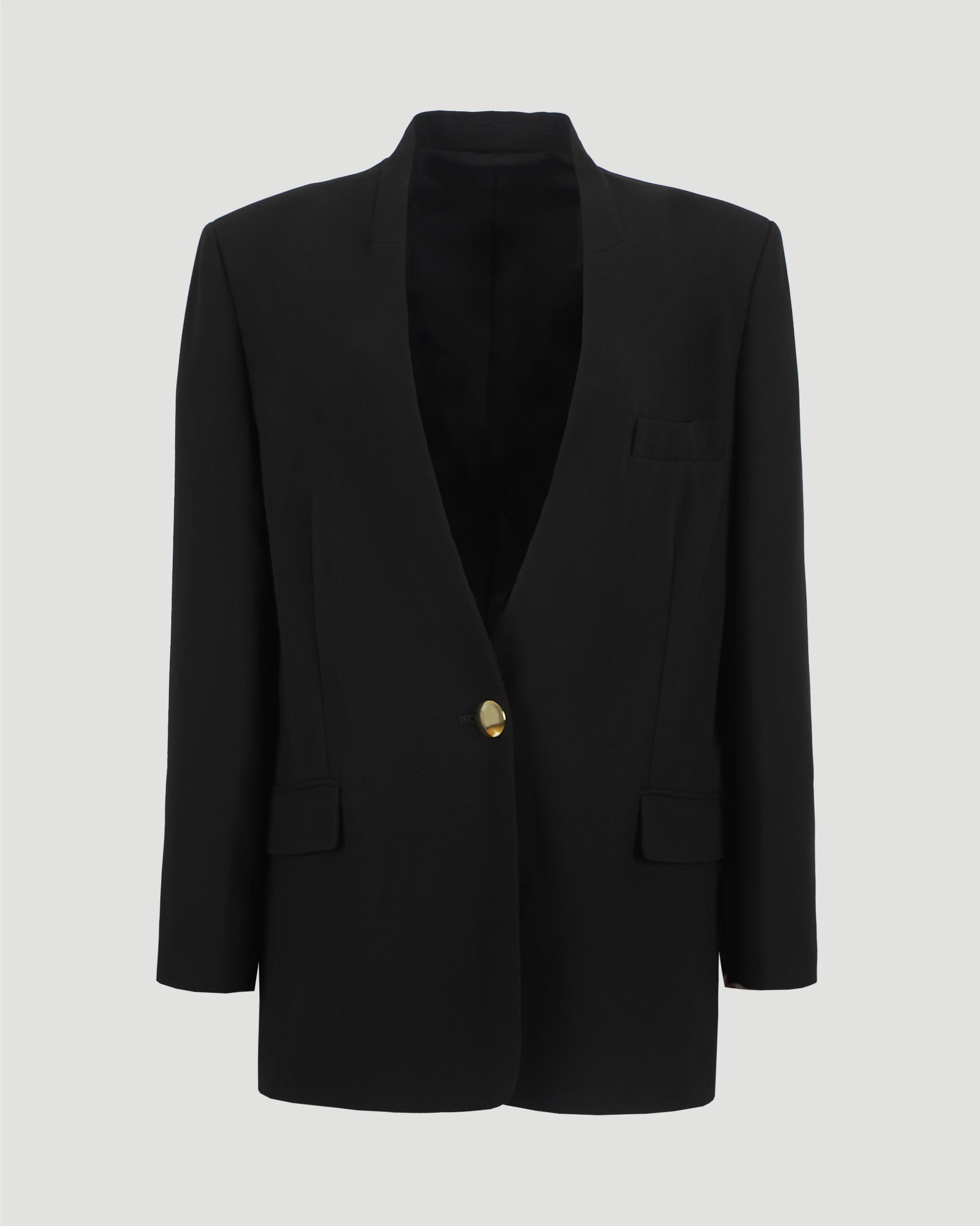 This flowing suit jacket by Isabel Marant features a collarless design with a relaxed fit. It has long sleeves with straight buttoned cuffs, a chest pocket, and flap pockets on the sides. The jacket fastens with buttons at the front, offering a modern and effortless look.