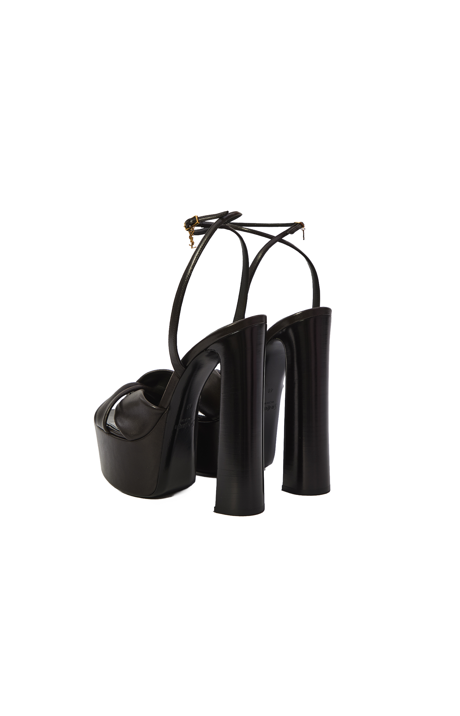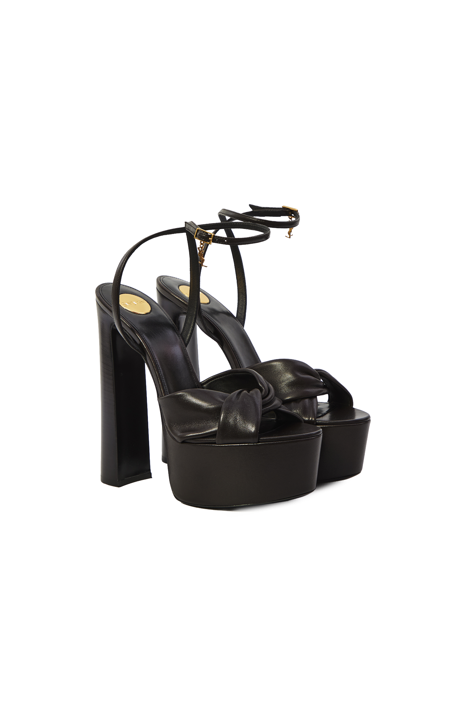 These platform sandals by Saint Laurent are crafted from calf leather. They feature twisted crisscross straps, a round toe, buckle fastening, a high block heel with platform, leather lining, and a Cassandre ankle charm.