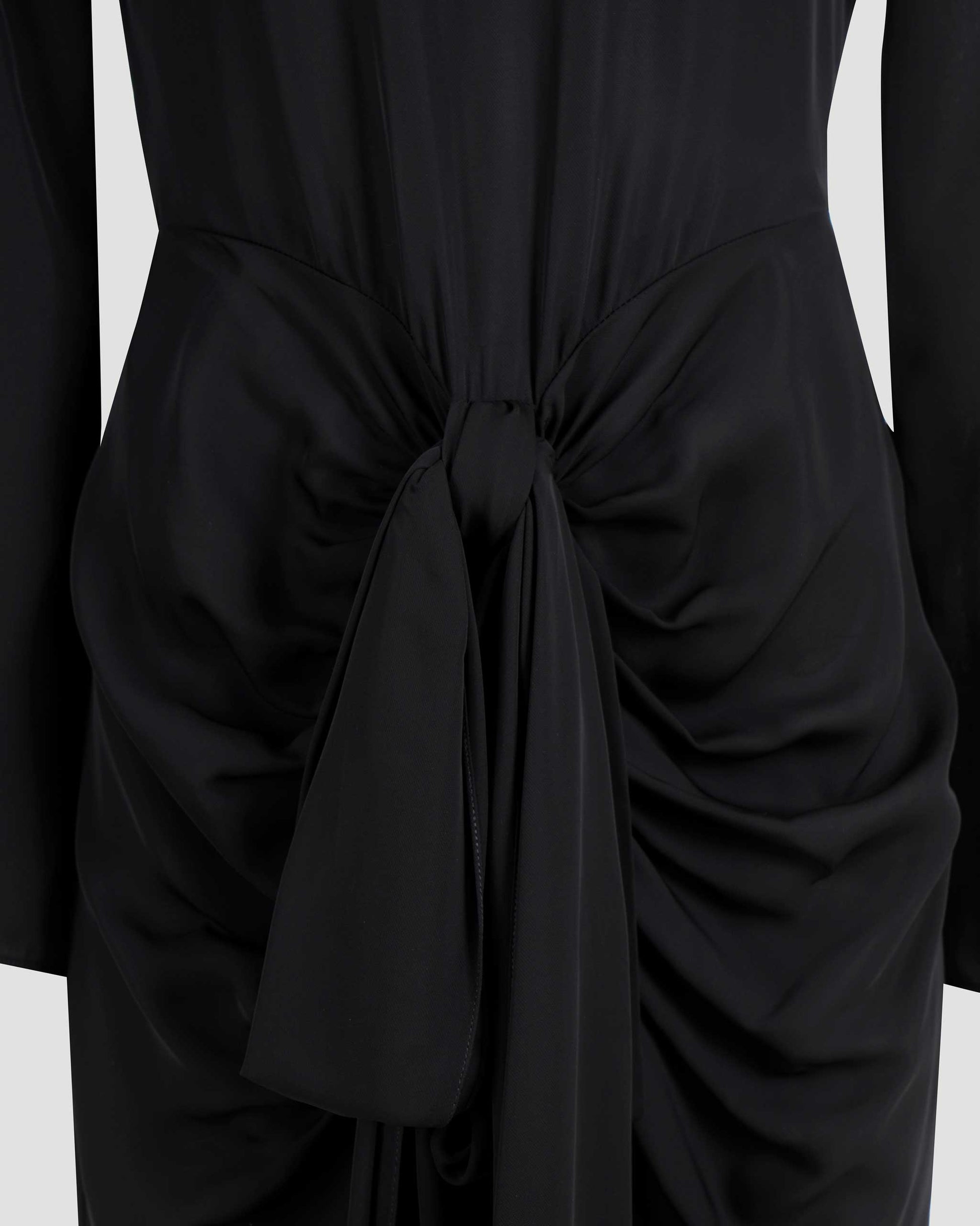 Midi dress by Alaïa, crafted from black fluid viscose. Features long sleeves and a bow accent at the waistline for a refined, feminine silhouette.