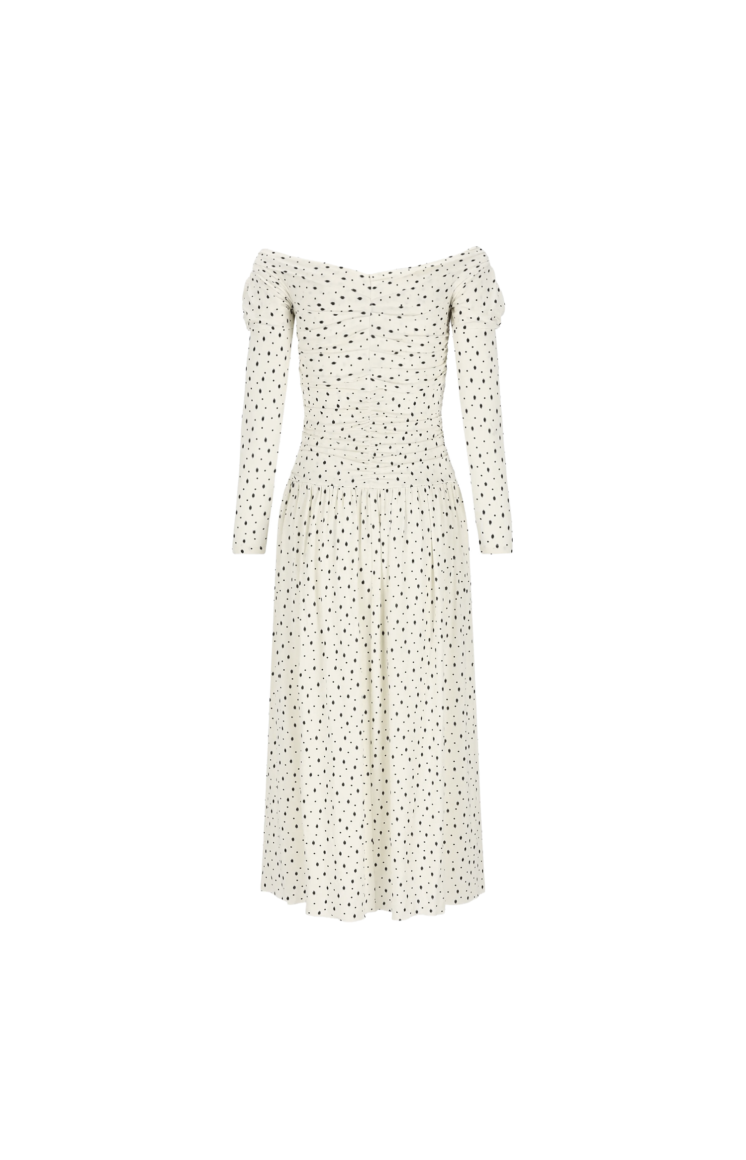 This Giovana midi dress by Isabel Marant is crafted with an all-over polka-dot print and a fitted silhouette. It features long puff sleeves, a V-neckline, front ruching, and a front slit.