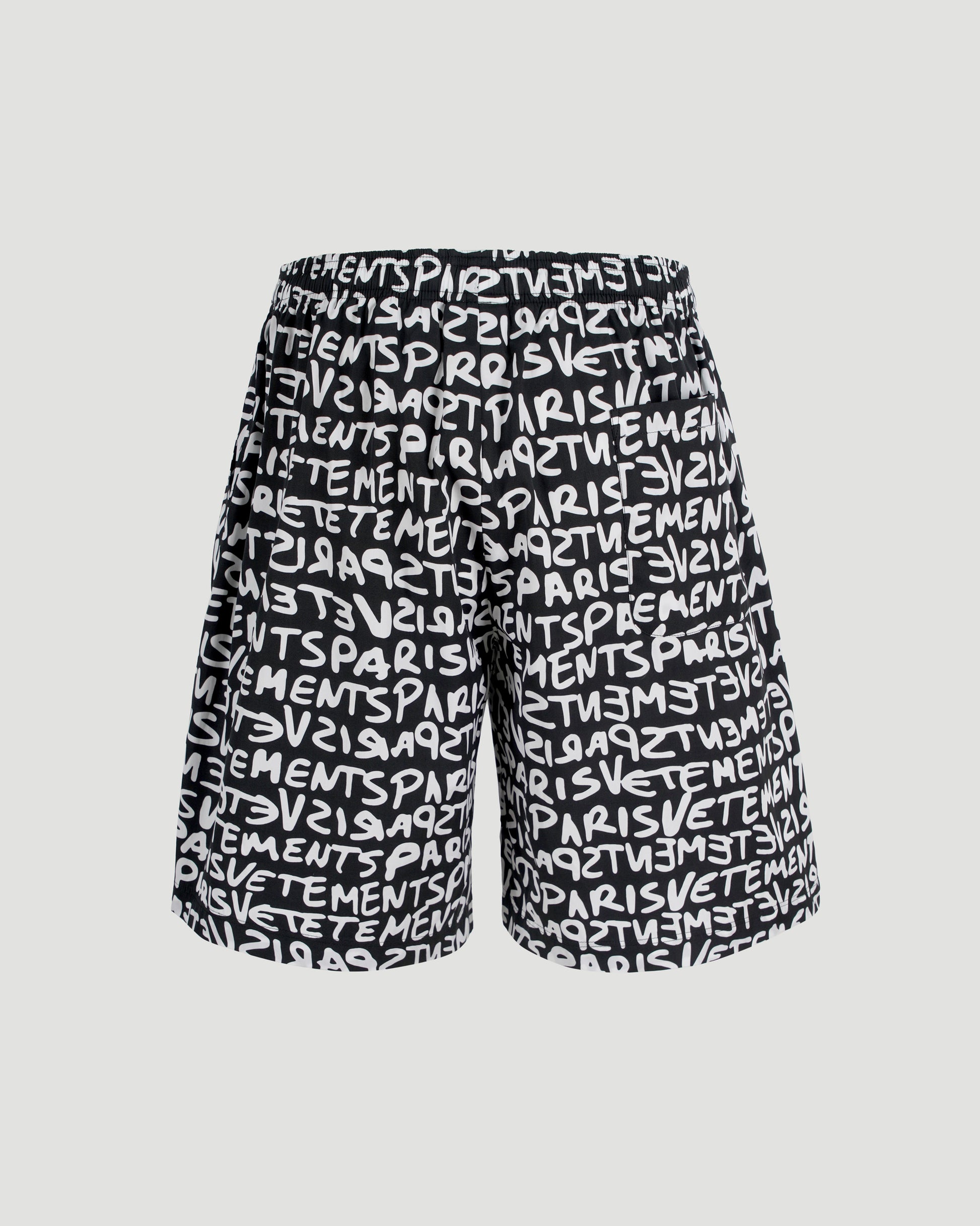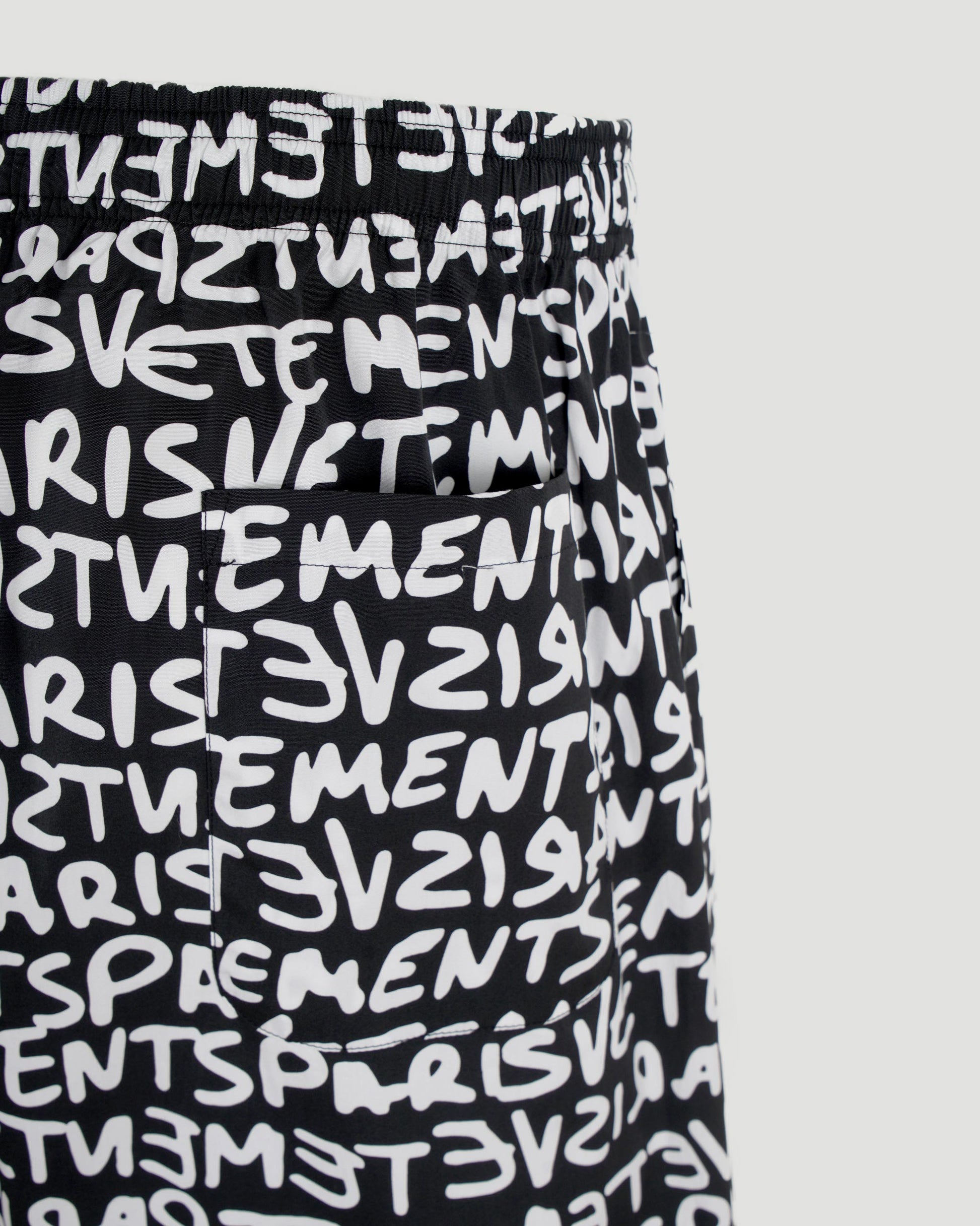 Vetements' poplin shorts released in a contrasting graffiti monogram in black and white. This style features an elasticated waistband, two slip pockets at the sides, and a rear patch pocket.
