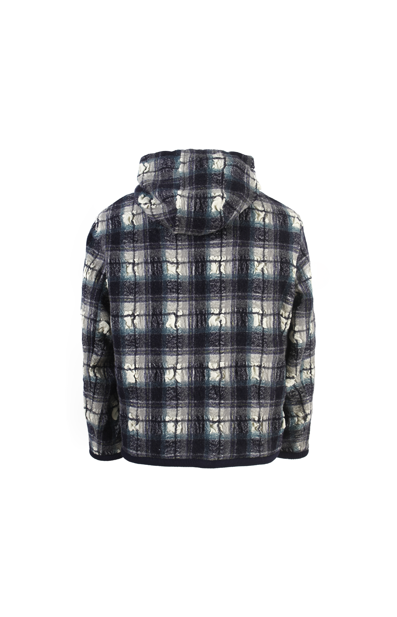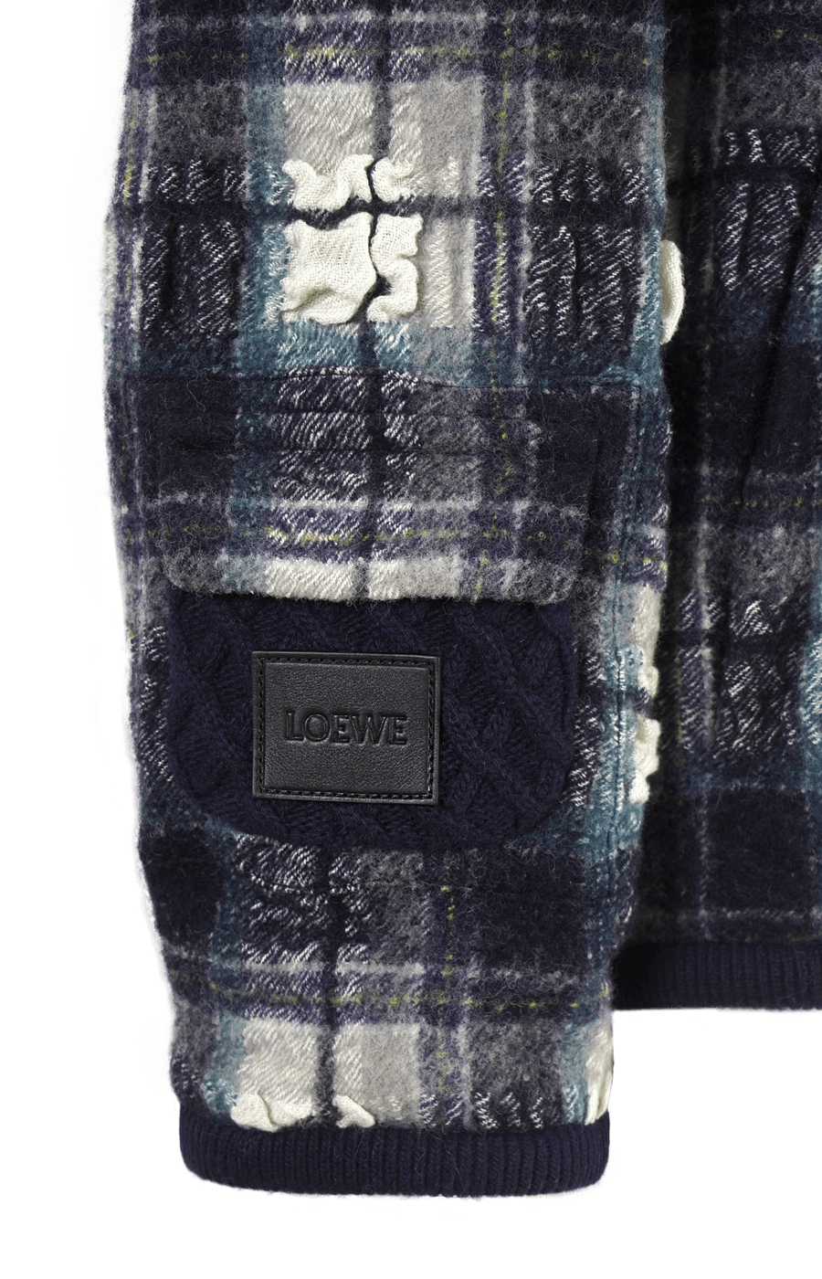 This jacket by Loewe is crafted from medium-weight boiled wool and linen with a crinkled finish and regular fit. It features a hooded collar with leather drawstring, zip front fastening with Puzzle puller, cable knit buttoned chest patch pocket, contrast fleece lining, rib-knit trims, a sleeve patch pocket, and an embossed leather patch detail.