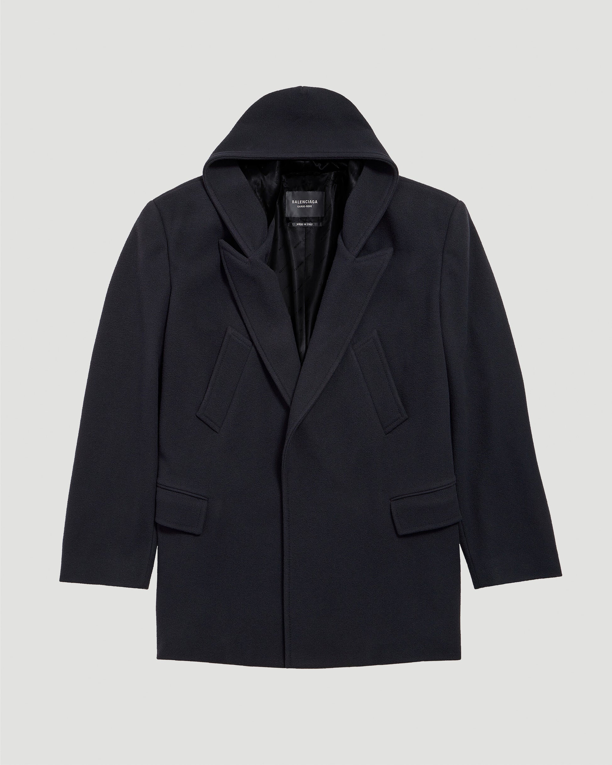 This Balenciaga hooded blazer is crafted in Italy from pure wool with a cupro lining. It features a structured silhouette with shoulder pads, peak lapels, two chest pockets, and two front flap pockets.