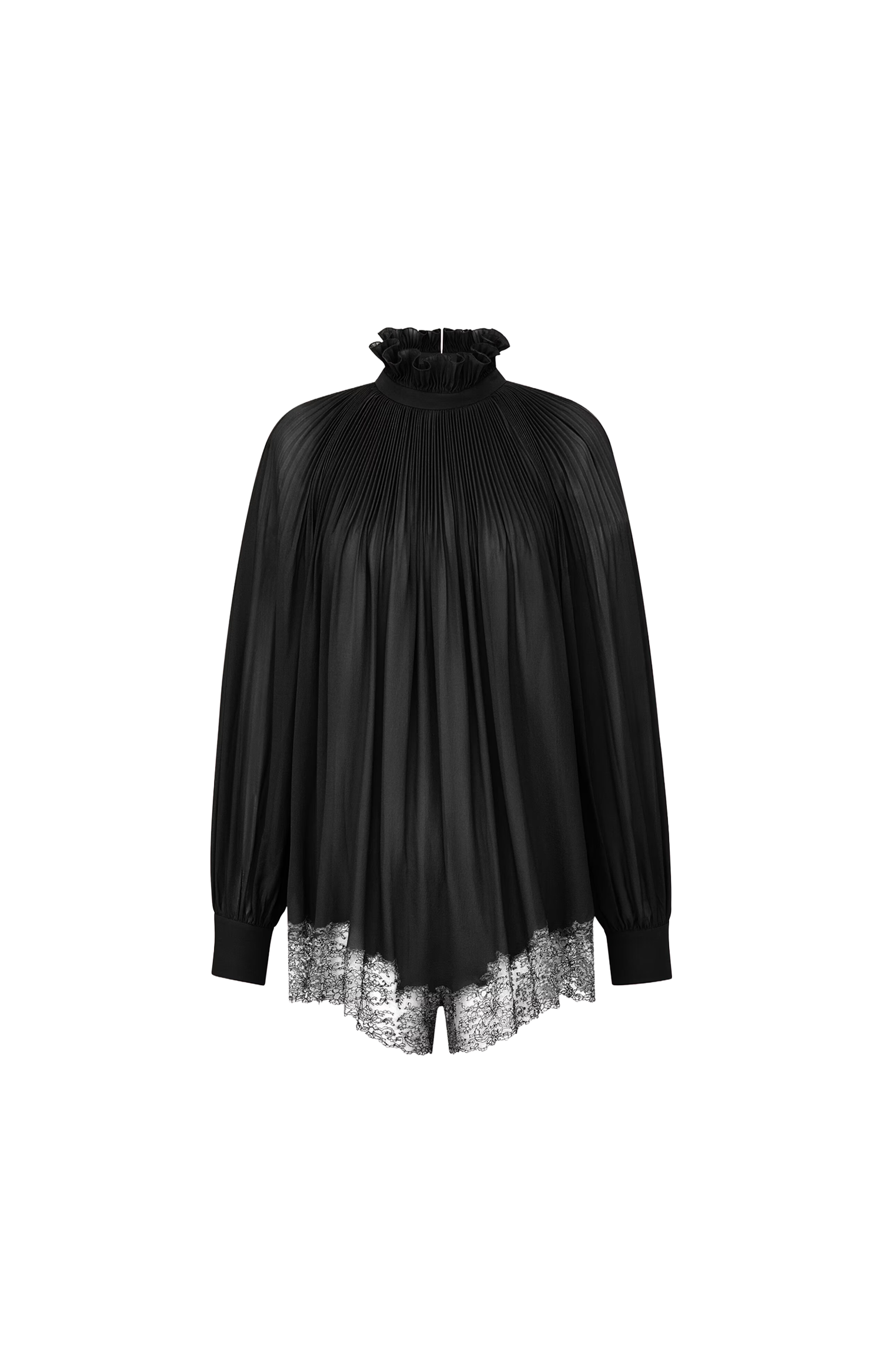 Oversized long-sleeve romper by Saint Laurent featuring a lavallière neckline, drop shoulders, and lace-trim shorts. Designed with a front button closure and one-button mitered cuffs.