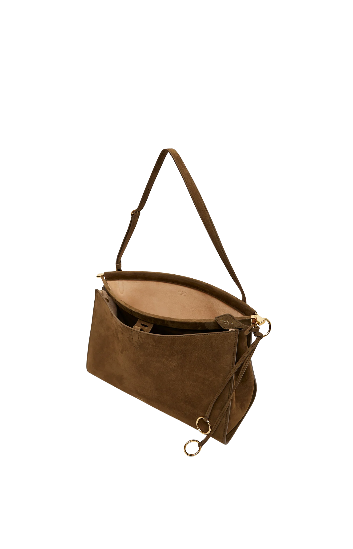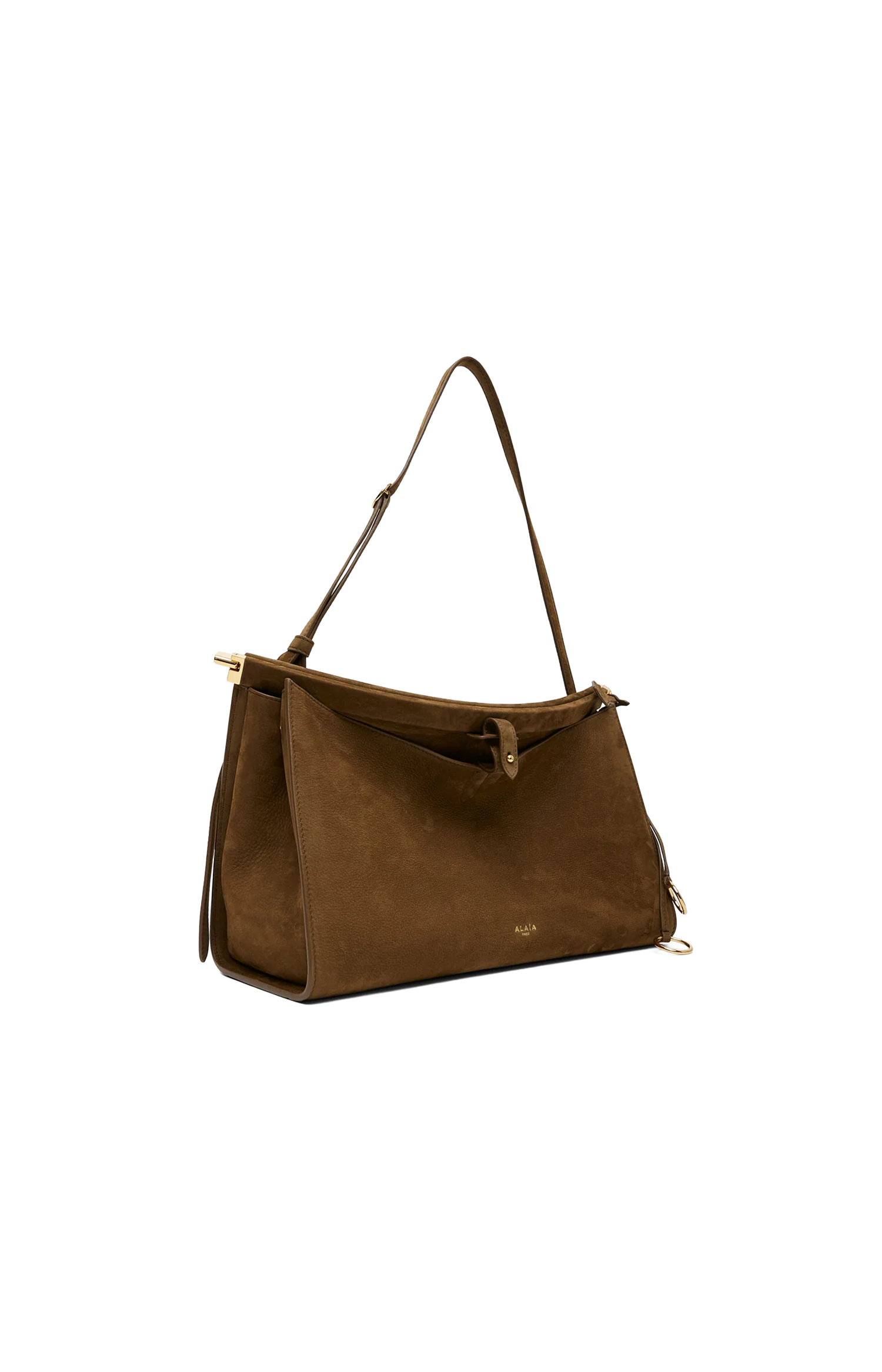 This Le Click Pocket 35 bag by Alaïa is crafted from nubuck calfskin leather. It features a curved silhouette, front pocket with tie closure, adjustable strap, hinge opening, and signature folding detail with metallic accents.