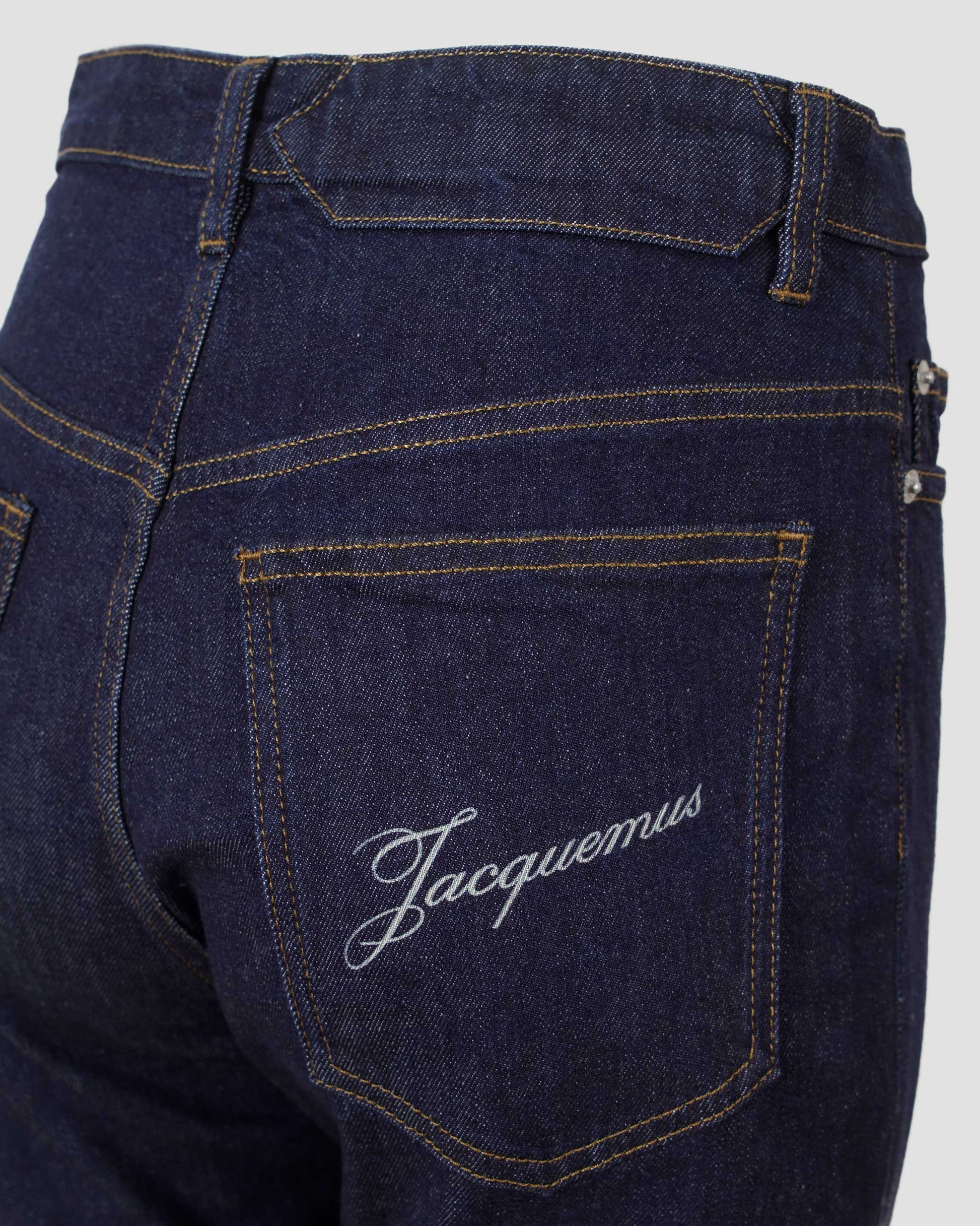 The Le De-Nîmes jeans by Jacquemus are crafted from dark blue cotton denim with a high-rise waist and long slim silhouette. They feature belt loops, a classic 5-pocket design, front button fastening, and a logo at the back pocket for a subtle branded finish.