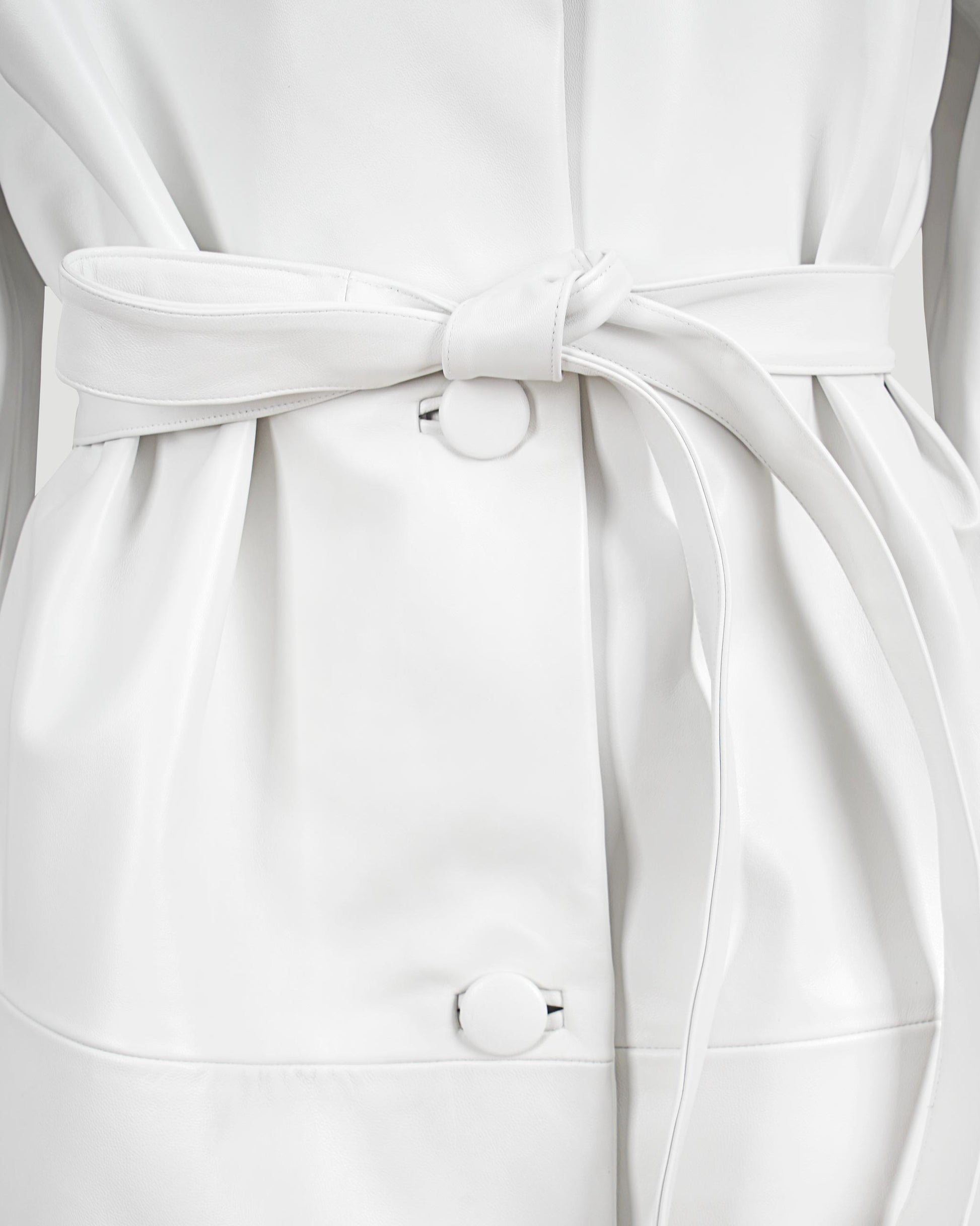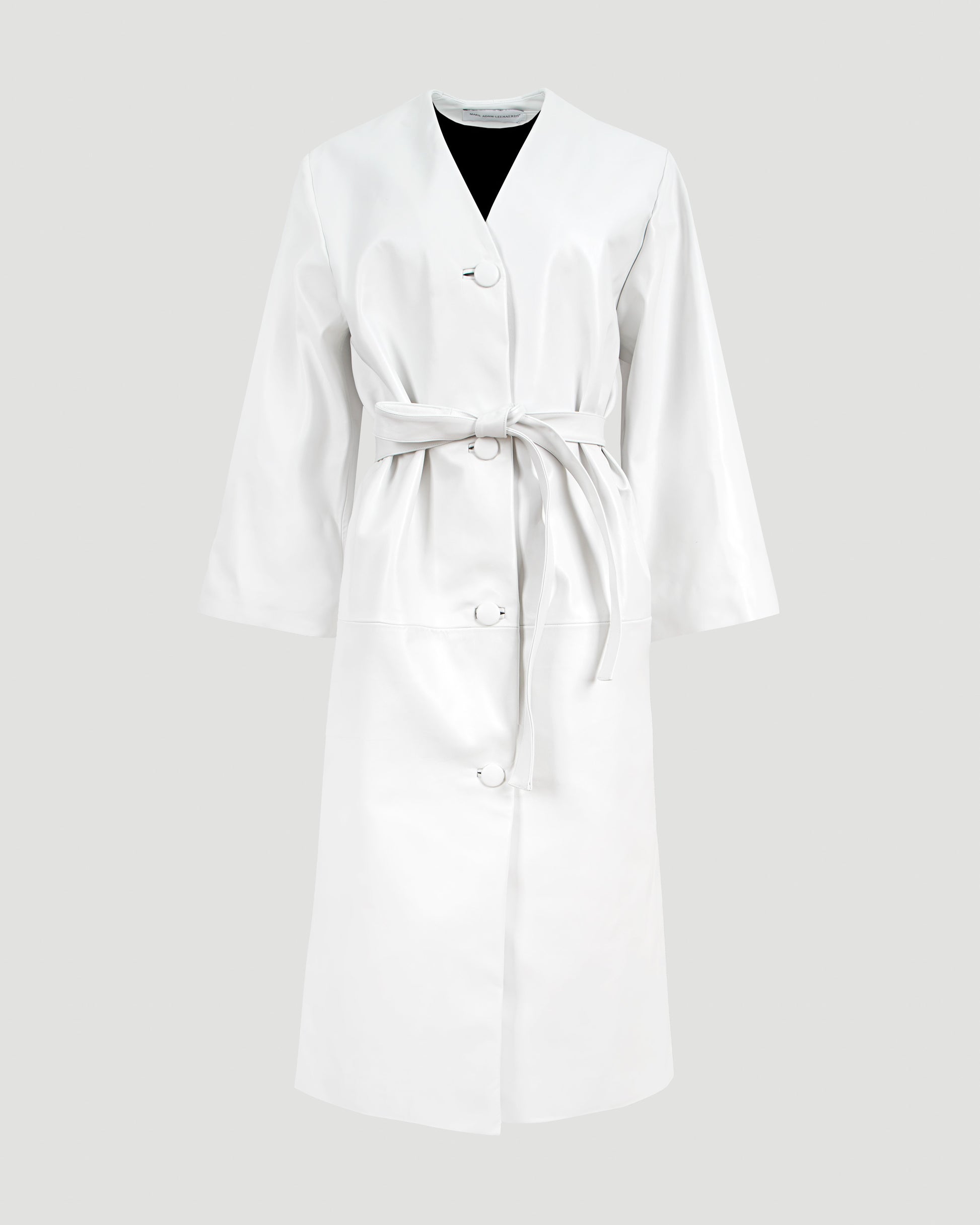 This coat by Marie Adam-Leenaerdt is a striking statement piece crafted in crisp white leather. Designed with cropped sleeves and a belted waist to accentuate the silhouette, it features a clean front button fastening for a minimalist yet structured finish.