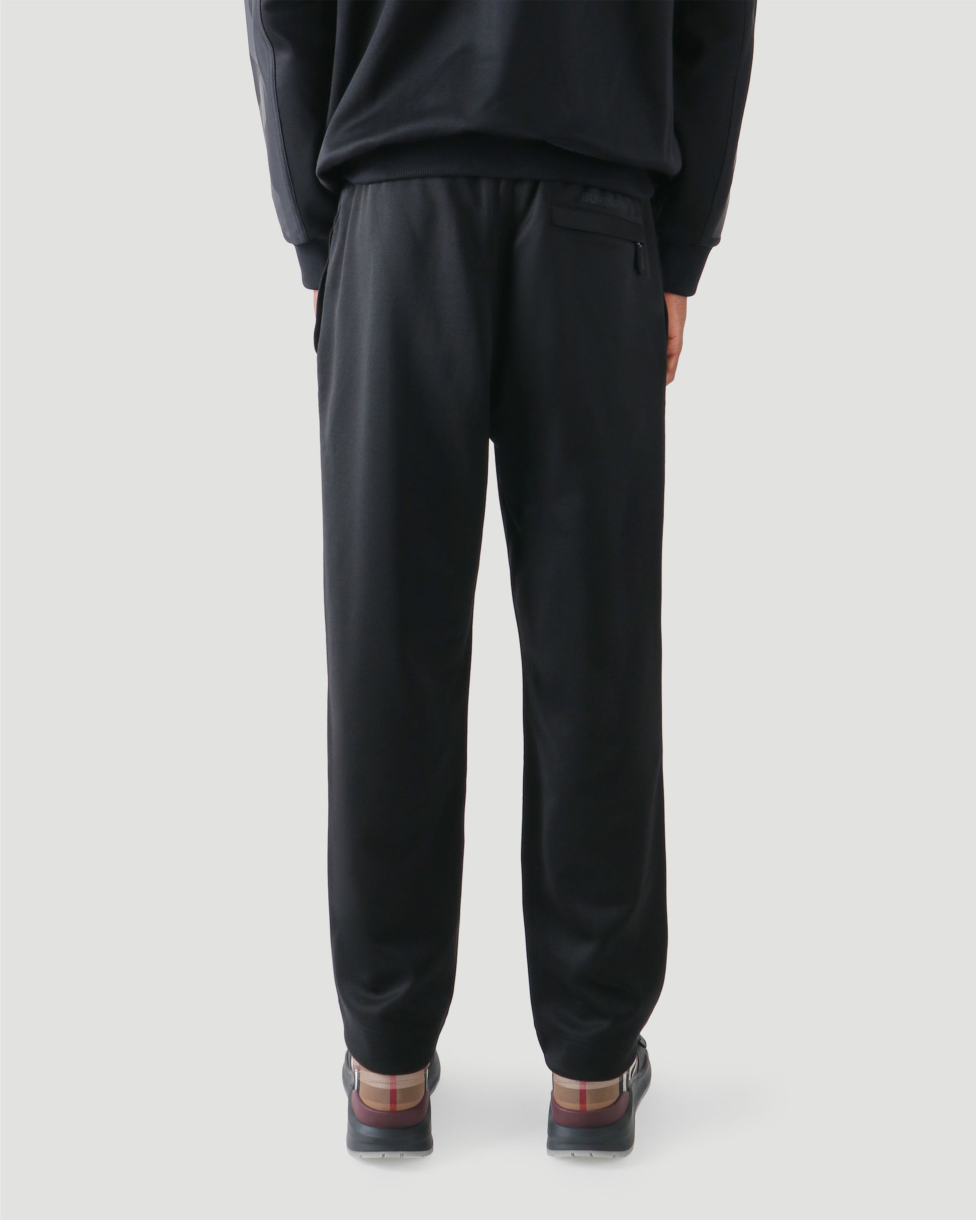 Straight leg jogging trousers in black by Burberry. Made from an Italian-woven cotton blend, they feature a relaxed fit, tagged with a discreet logo at the back zip pocket. Pair with a tonal zip up jacket and a cap for a cool, low-key look.