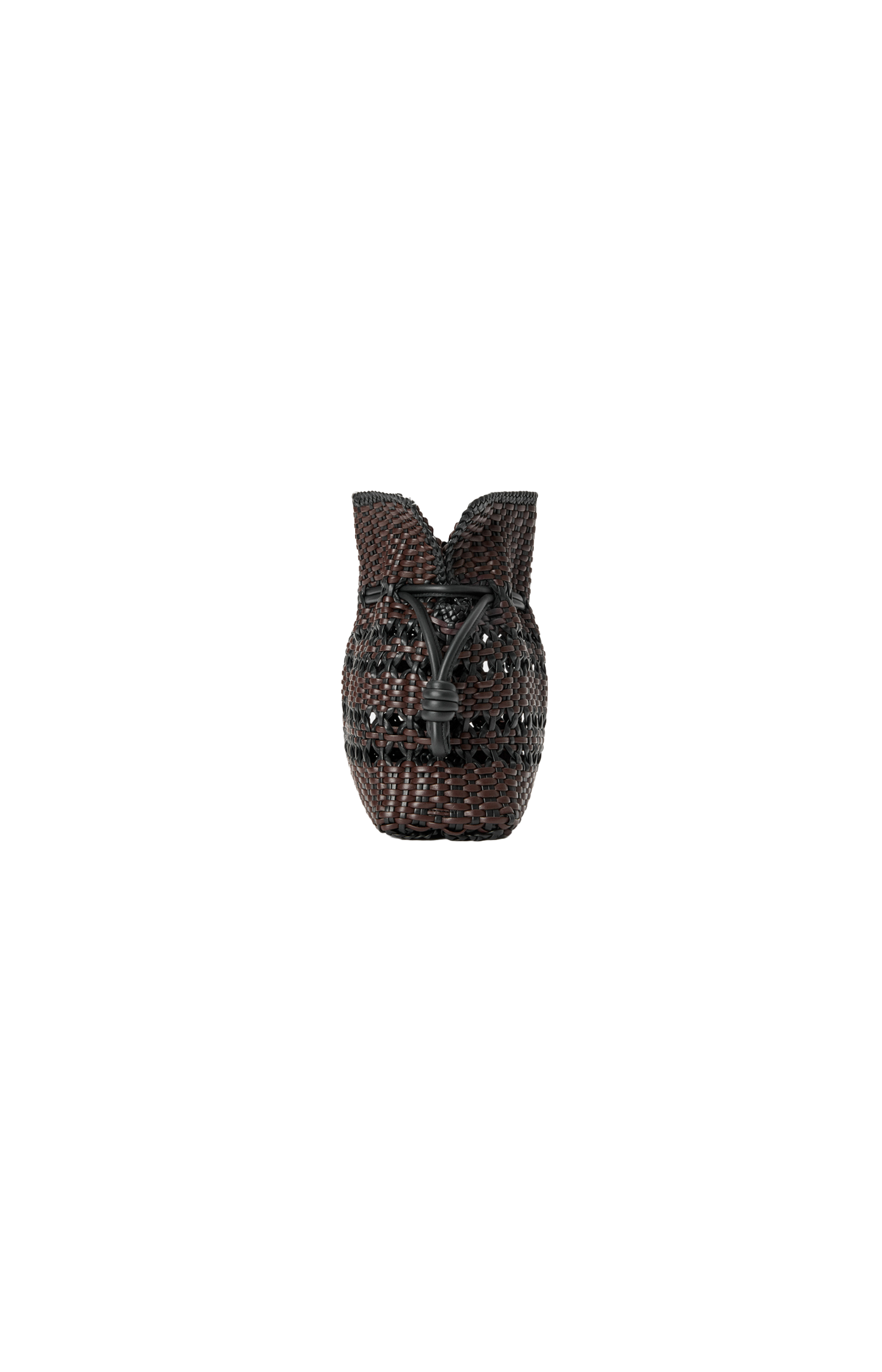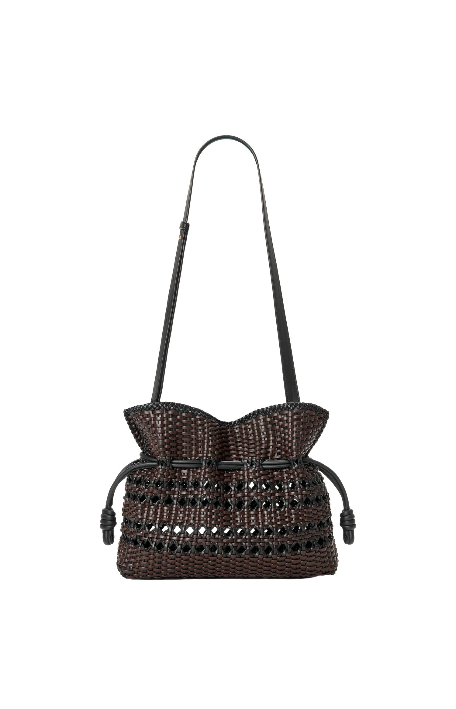 This Flamenco clutch by Loewe is crafted from two-tone hand-woven nappa calfskin. It features a cinched closure with knot drawstrings and magnetic fastening. A detachable and adjustable strap completes the design.