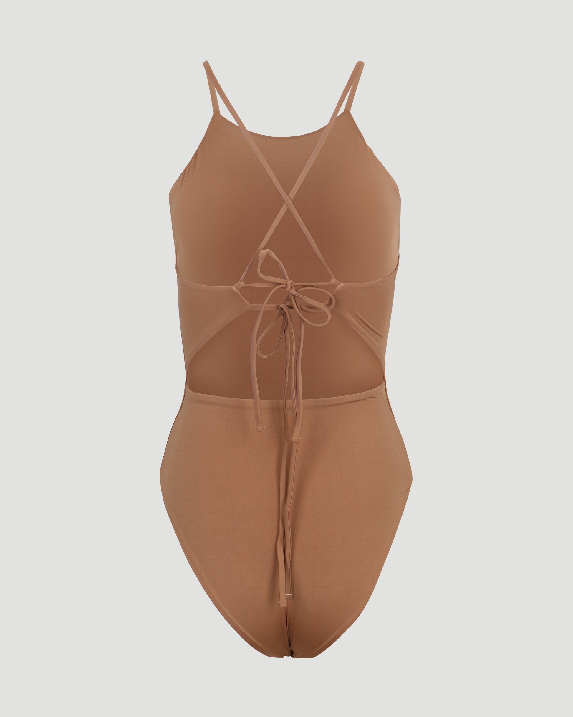 A well made swimsuit in a nude color is always a must in your summer essentials wardrobe. This one-piece swimsuit from Maygel Coronel is designed with an high-cut silhouette, round neckline and thin long straps that allow creating different ties.
