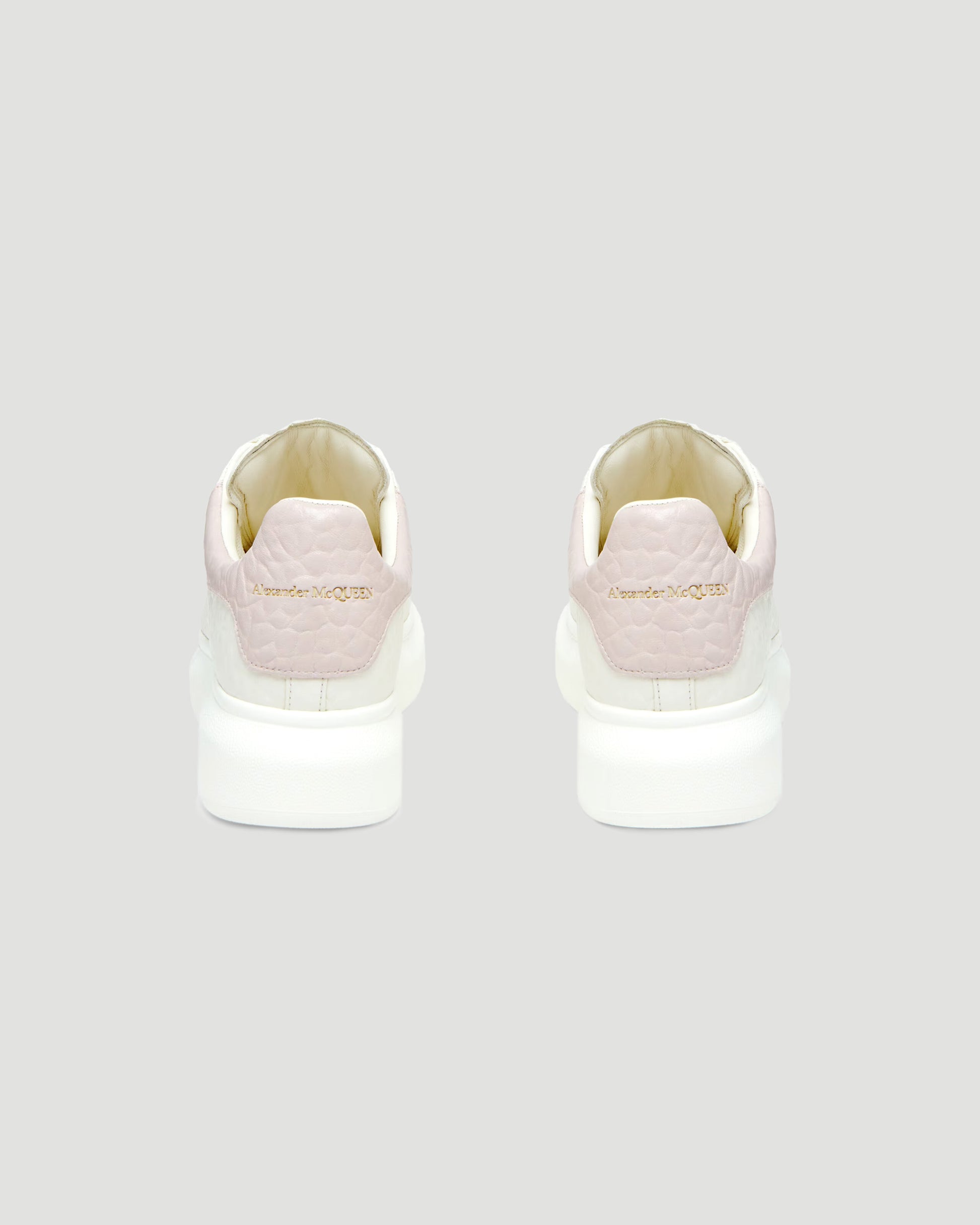 The iconic oversized sneakers by Alexander McQueen in off white grainy calf leather with a contrasting soft pink heel counter. Featuring a rounded toe and a chunky rubber sole.