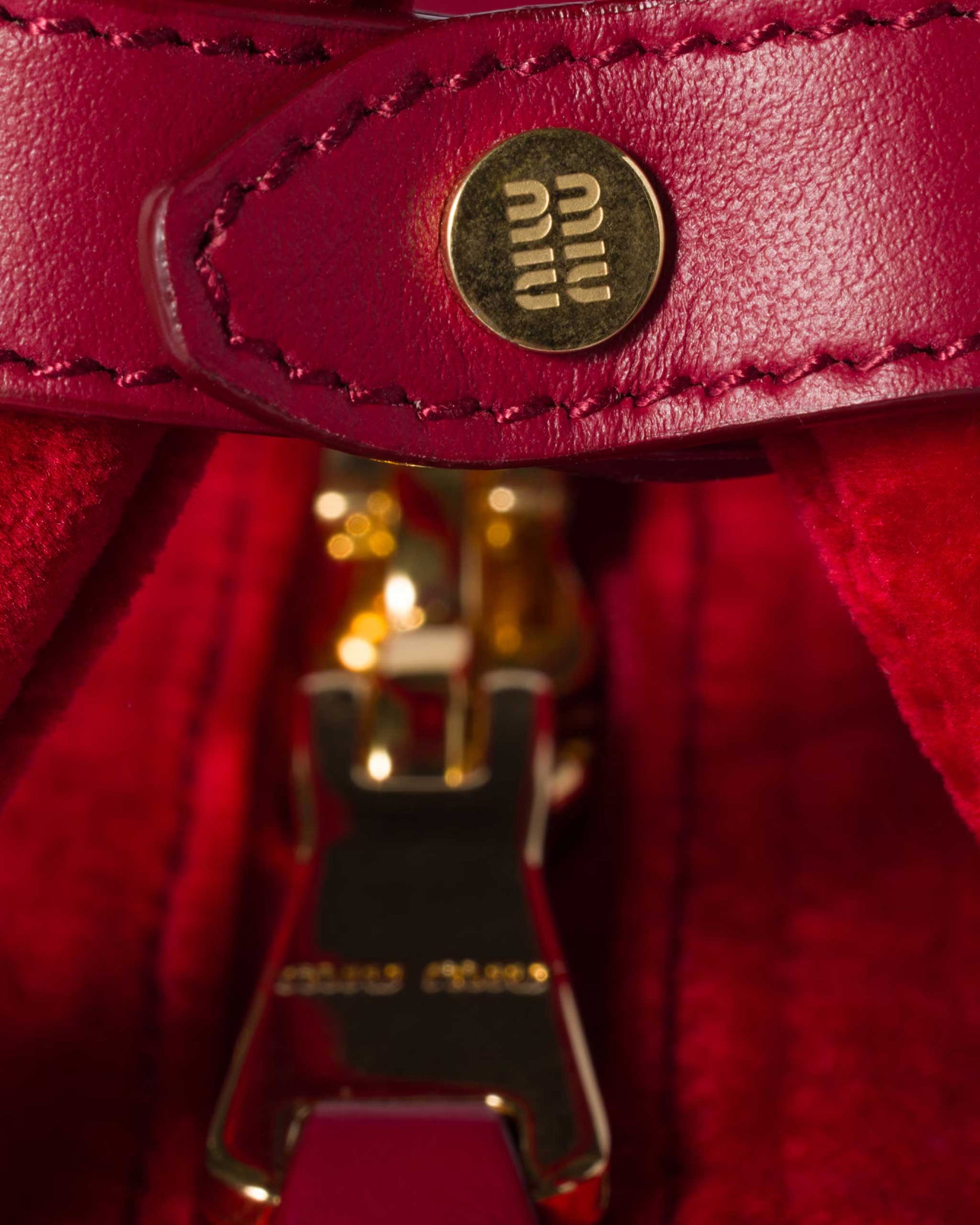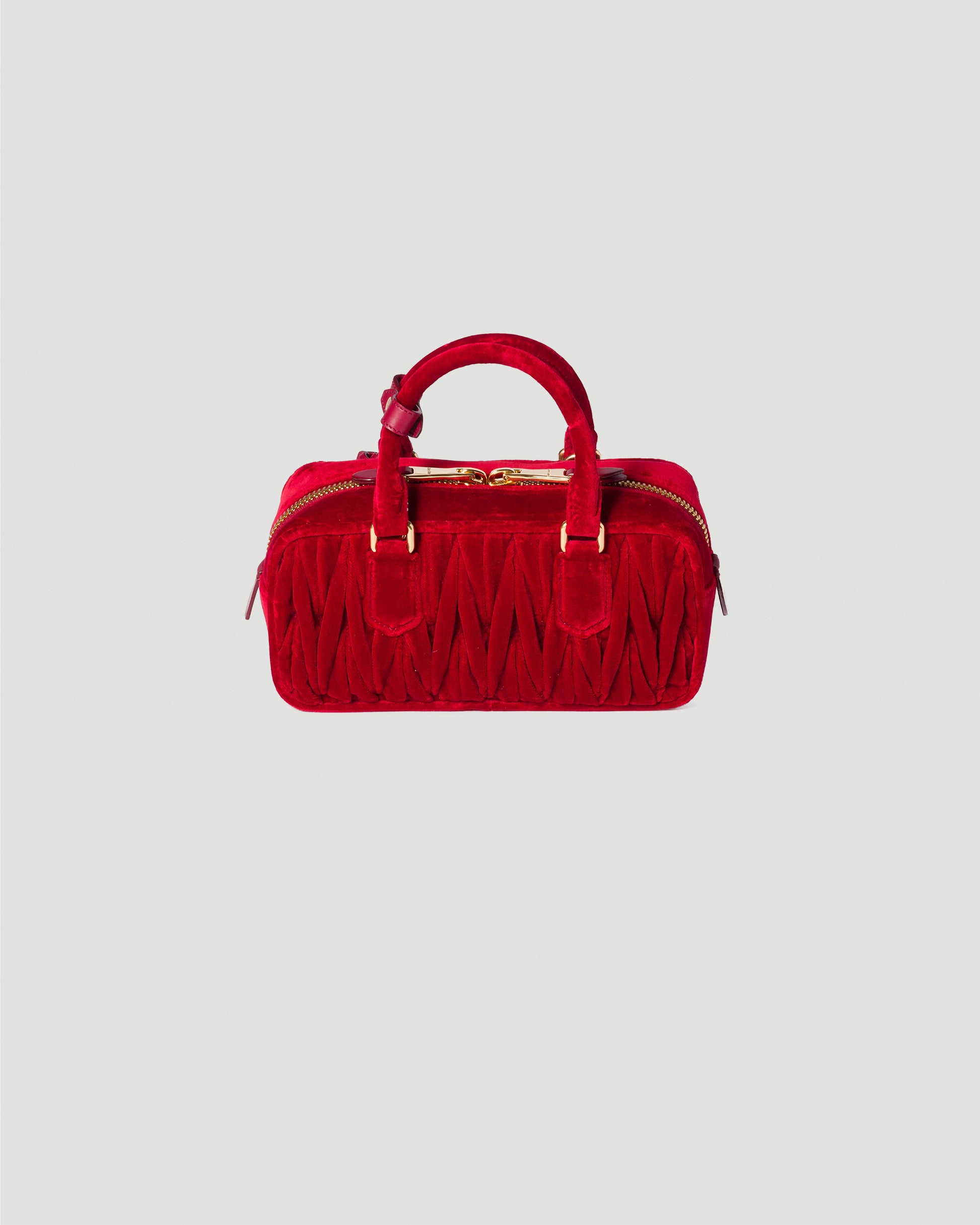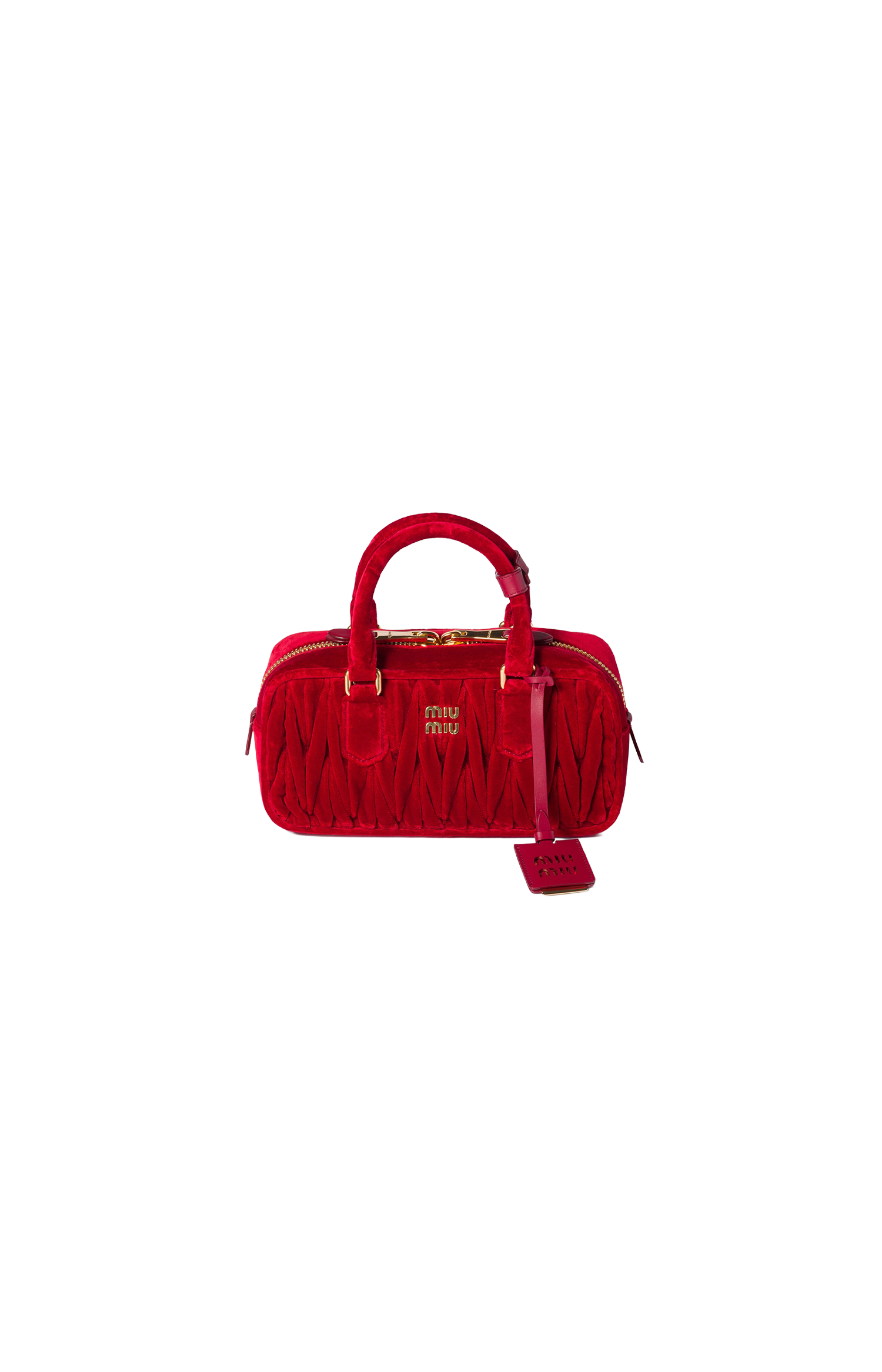This Arcadie bag by Miu Miu is crafted from red quilted velvet and features a structured silhouette with fixed top handles and a removable, adjustable shoulder strap. Designed with a double-slider zip closure, it includes a cotton satin–lined interior with a zipped pocket, a removable leather mirror case, metal lettering logo, and gold-tone hardware. Dust bag included. Made in Italy.