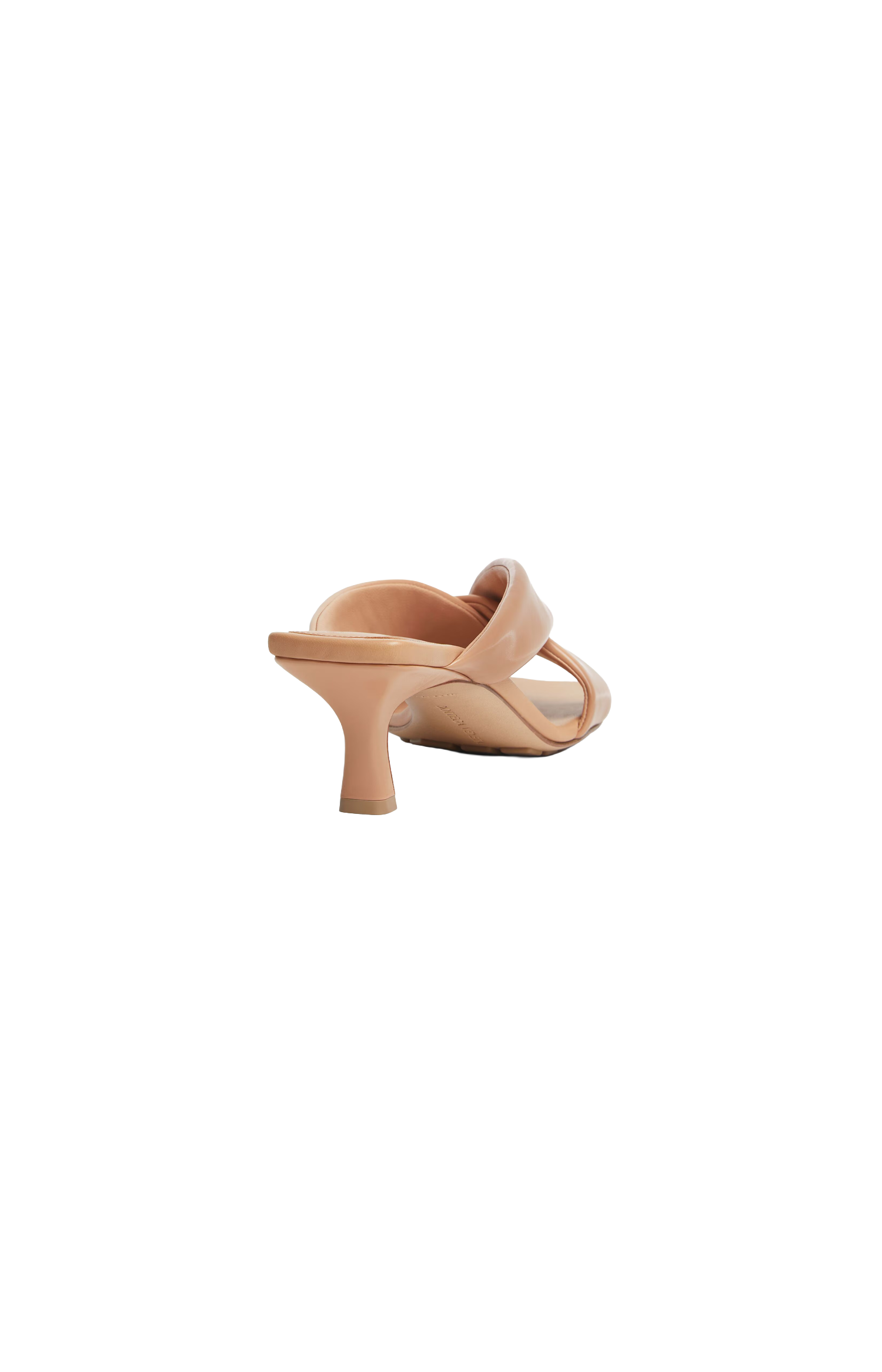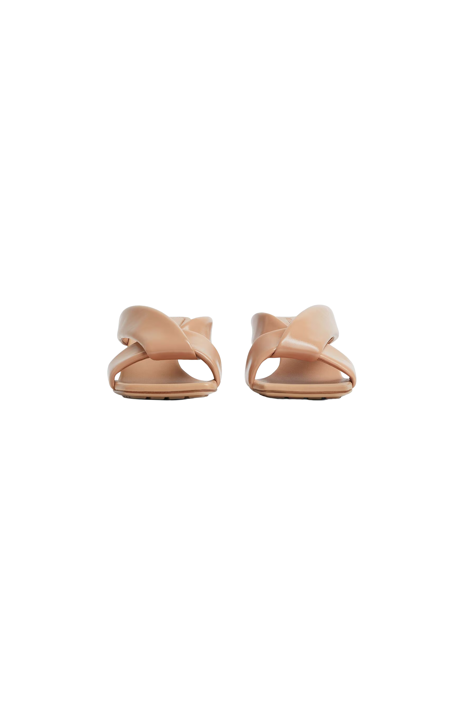 This mule sandals by Bottega Veneta are crafted in shiny calfskin leather with padded tubular straps in a twisted design. They feature a kitten heel, lambskin lining, and a rubber-injected leather outsole. Made in Italy.