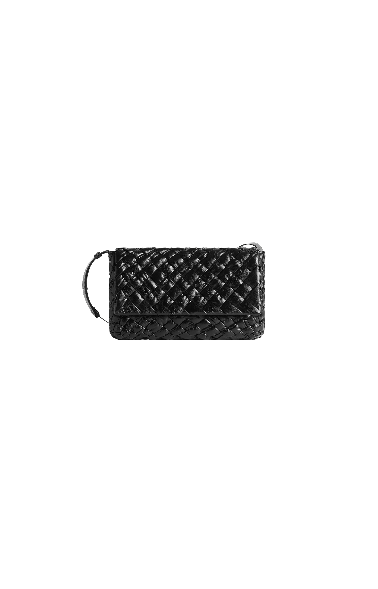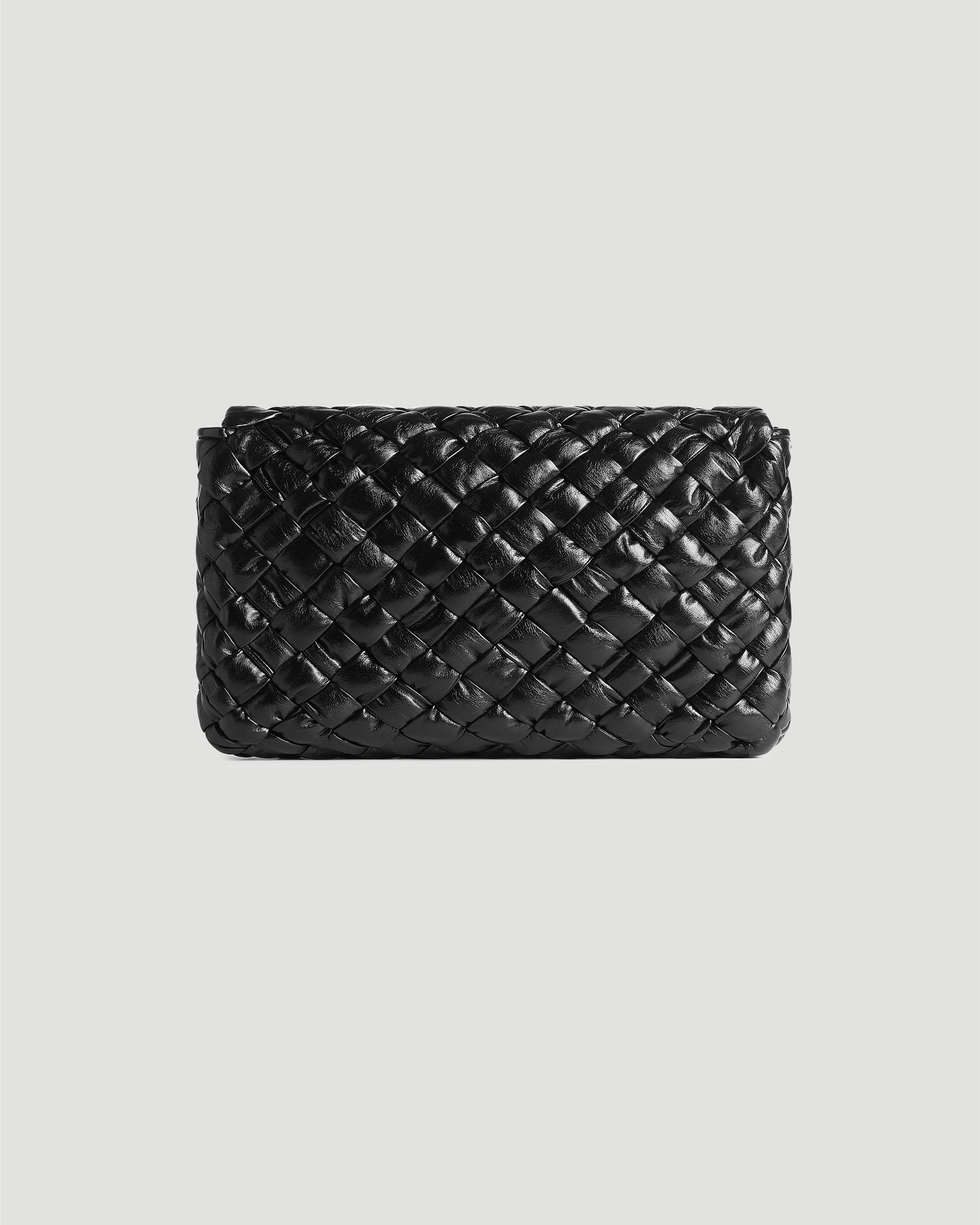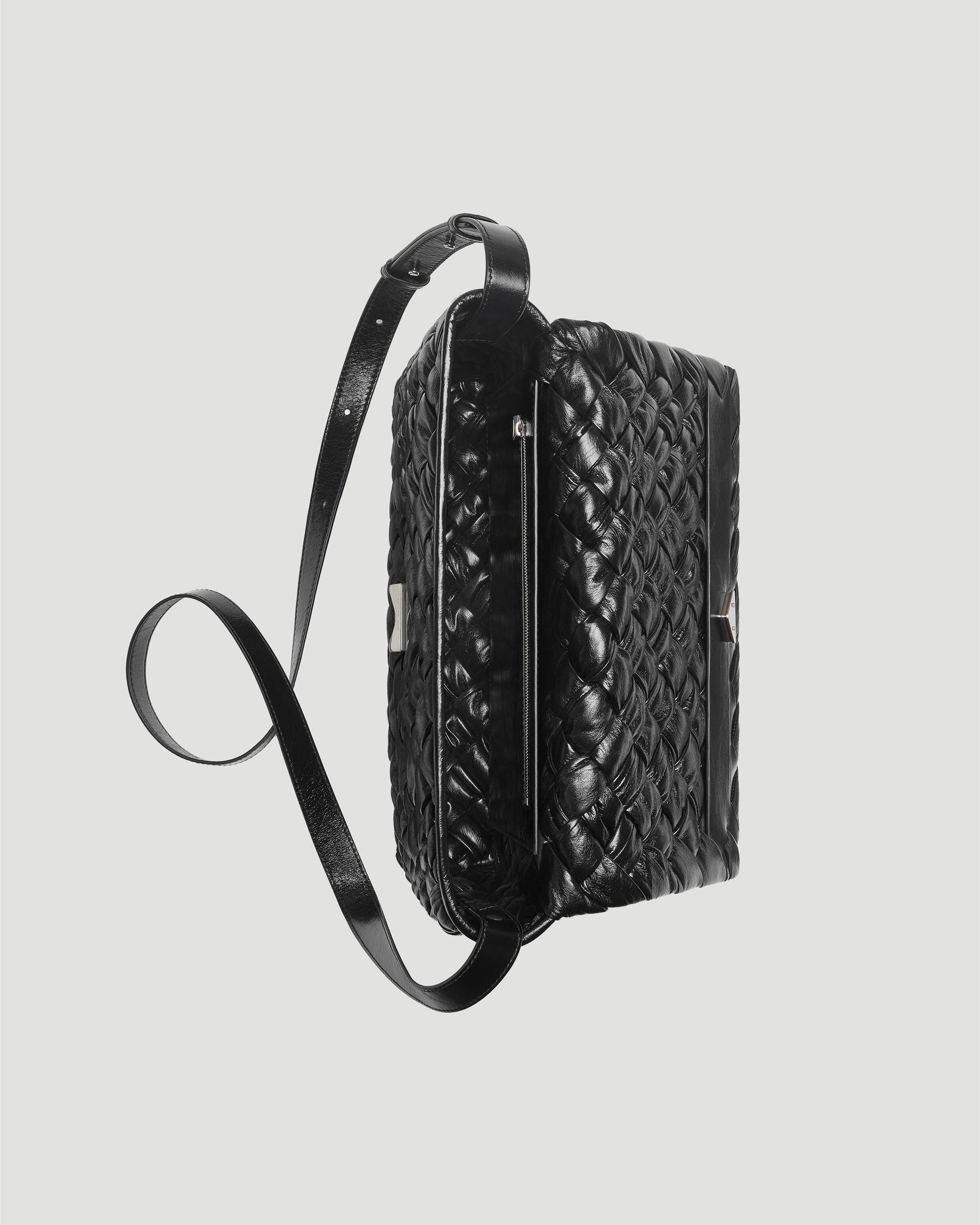 Bottega Veneta introduces the Rumple Messenger bag in shiny foulard Intreccio leather in black. This cross-body style is completed with an adjustable strap, a single interior zippered pocket, and a magnetic closure.