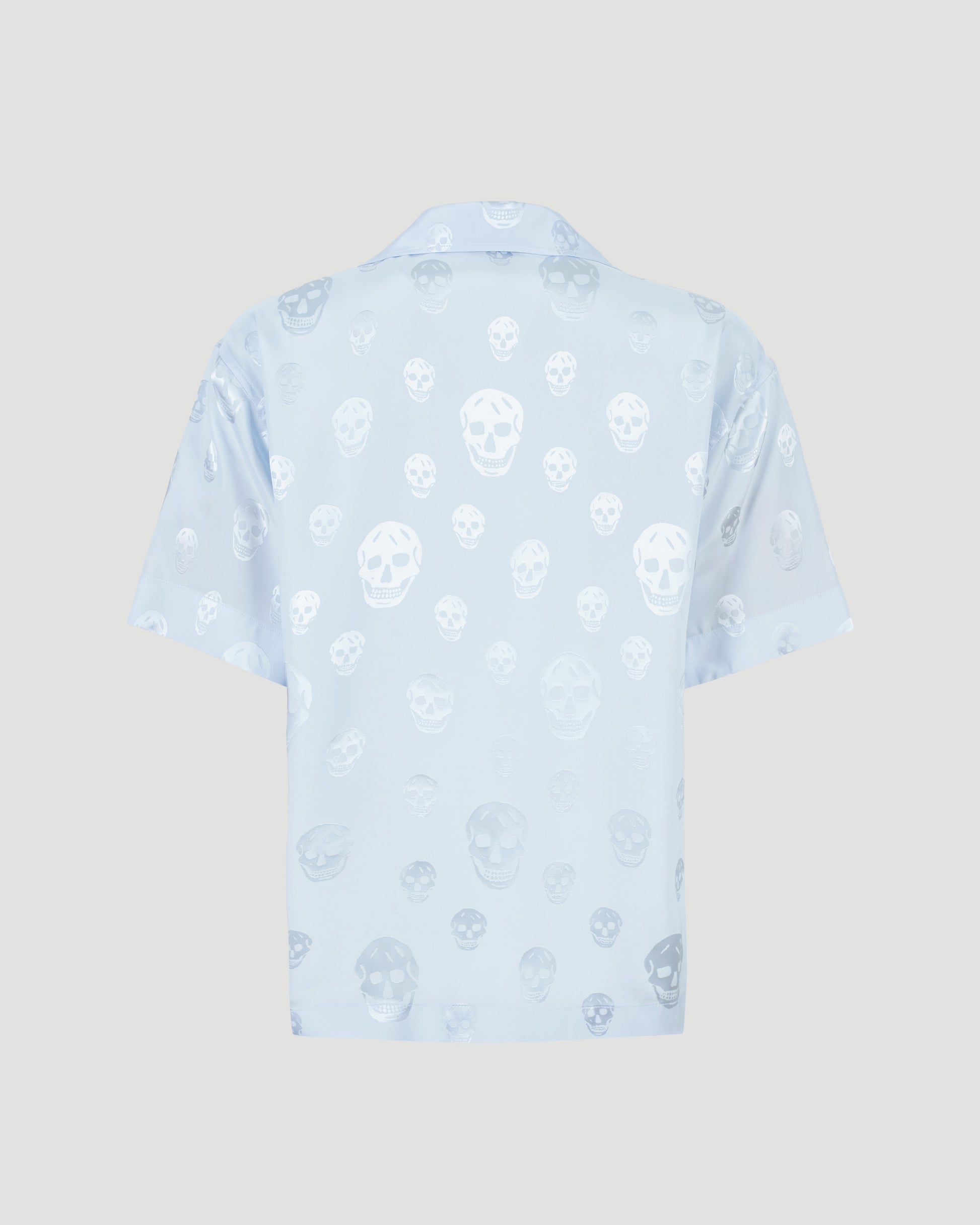 This shirt by Alexander McQueen is crafted from soft ice-blue viscose and detailed with an all-over skull print. It features a camp collar, short sleeves, a chest pocket, and a front button fastening.