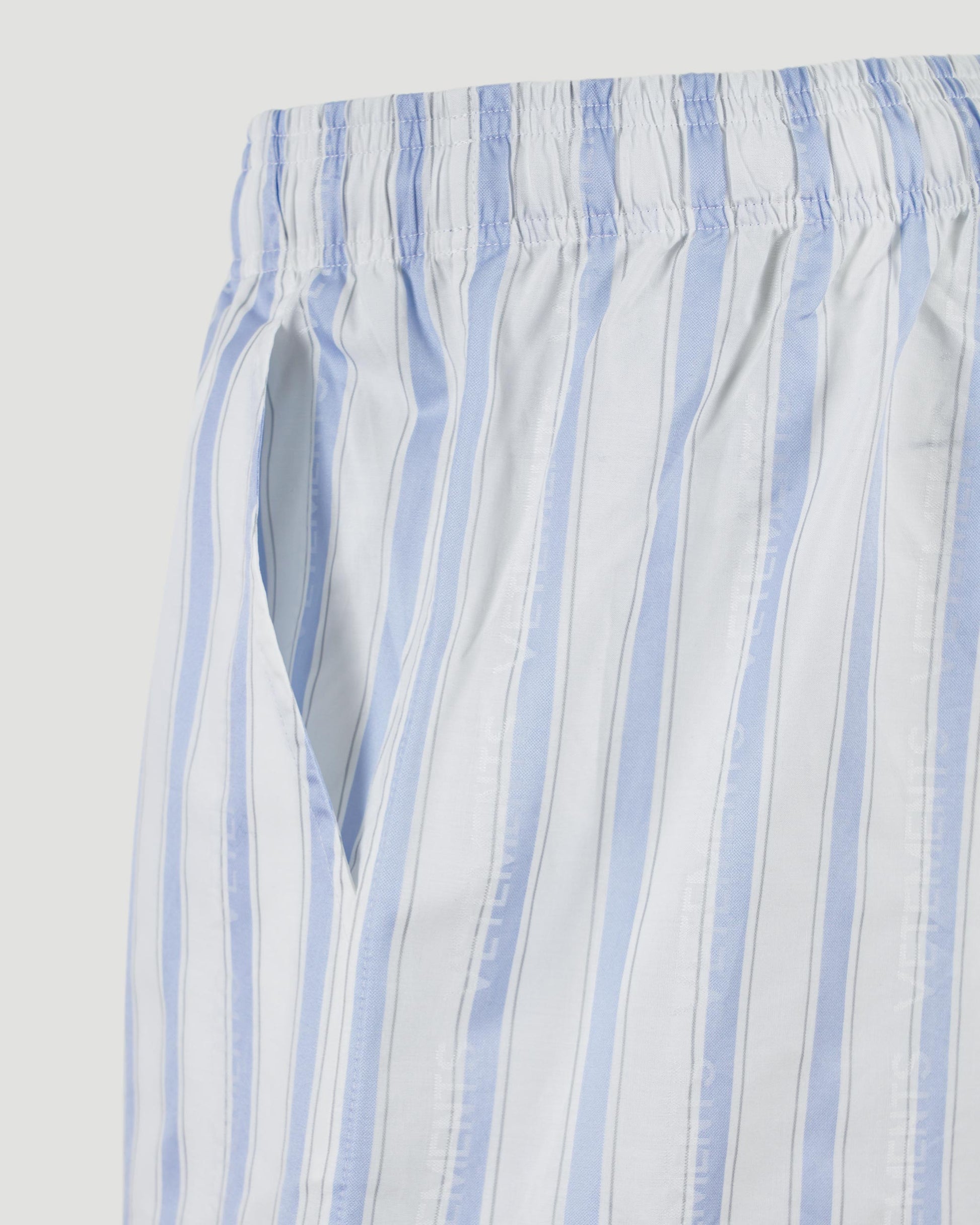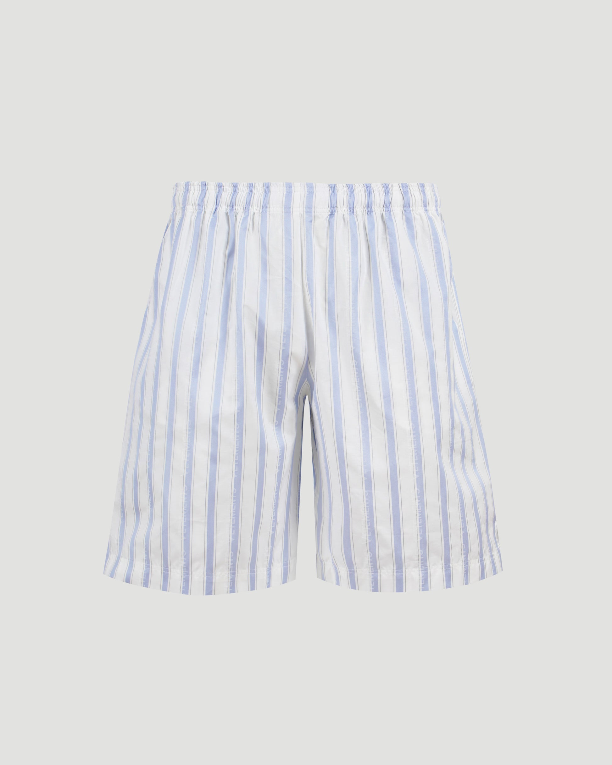 These shorts by Vetements feature a relaxed fit with light blue and white vertical stripes. Designed with an elasticated waistband for comfort, side pockets for functionality, and a single back pocket for added detail. Ideal for casual wear.