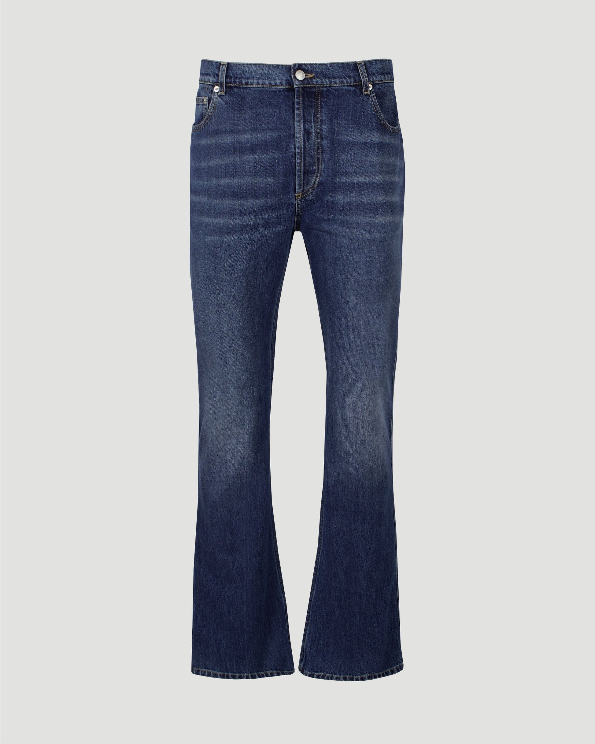 A classic pair of blue jeans by Alexander McQueen. With a vintage-style wash, they are cut to a straight fit, with a five pocket design, belt loops and leather logo patch at the back.
