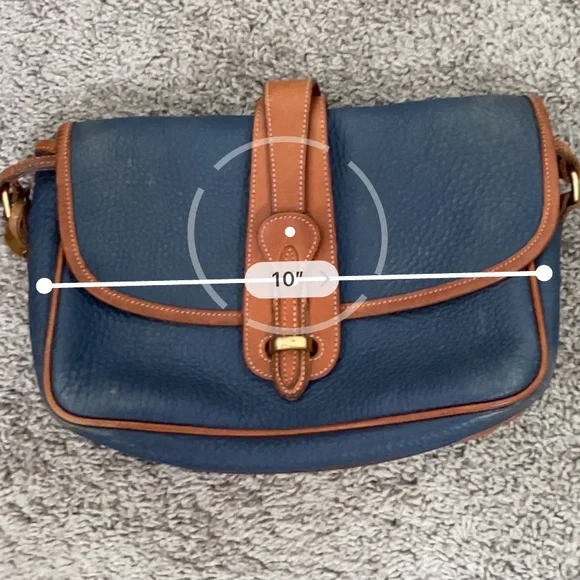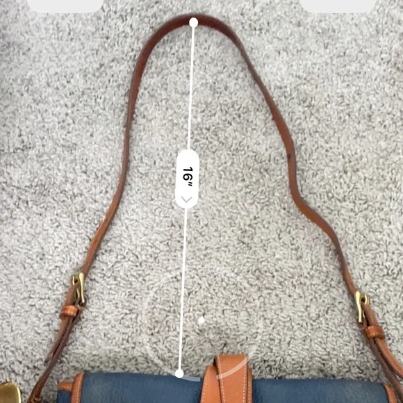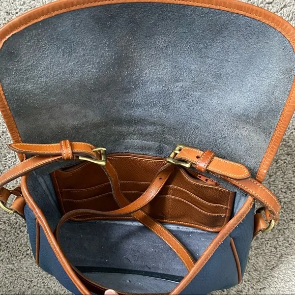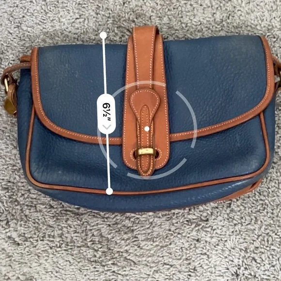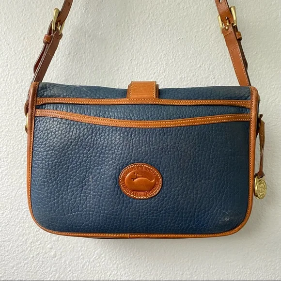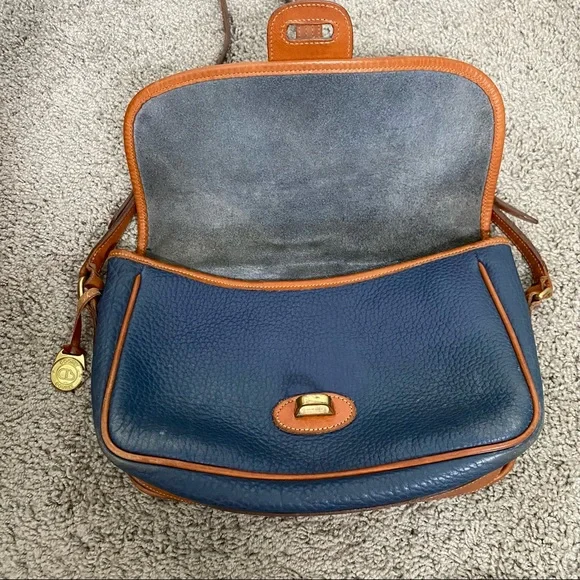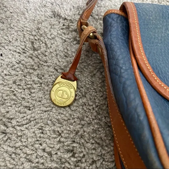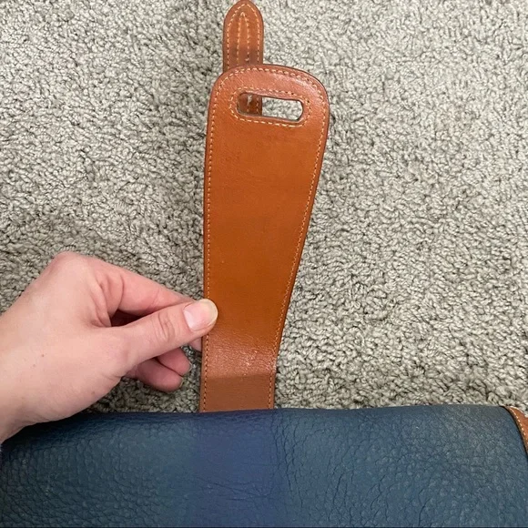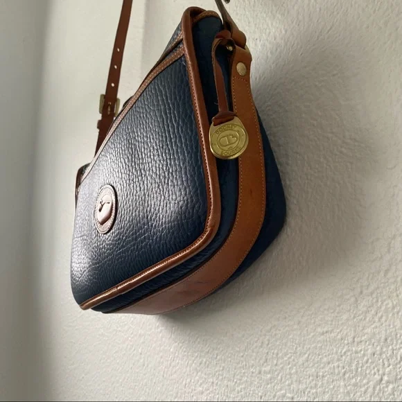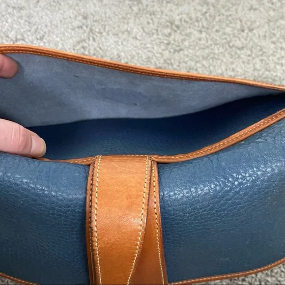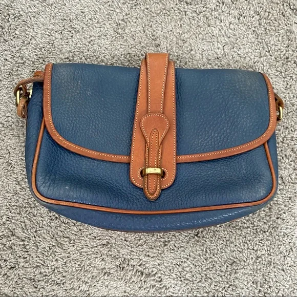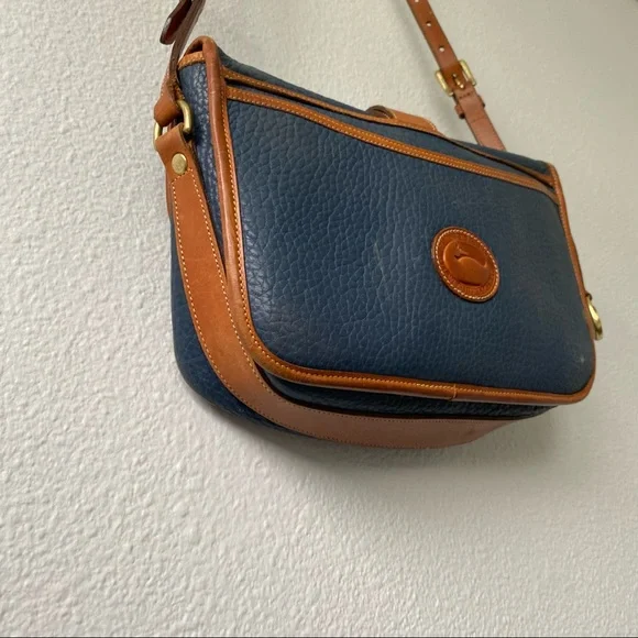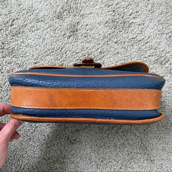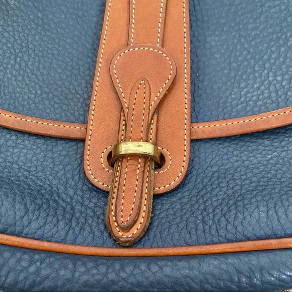Vintage Dooney & Bourke Blue and Brown Leather Messenger Style Saddle Crossbody Shoulder Strap Bag, adjustable strap length brass buckle straps. front brass buckle with double leather straps.Subtle scuffs and signs of wear but still in great vintage conditionMeasurements: see photos, strap length is adjustable