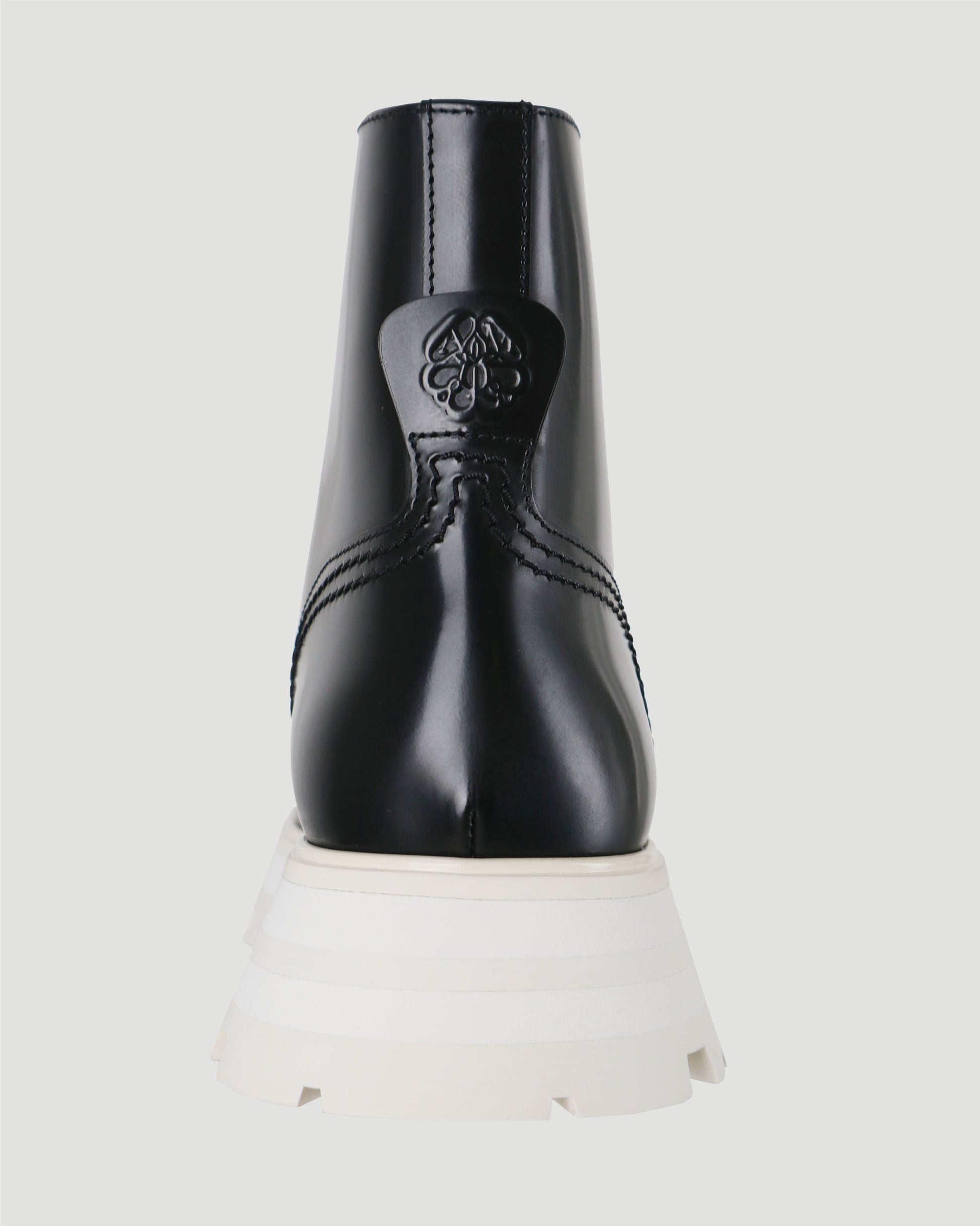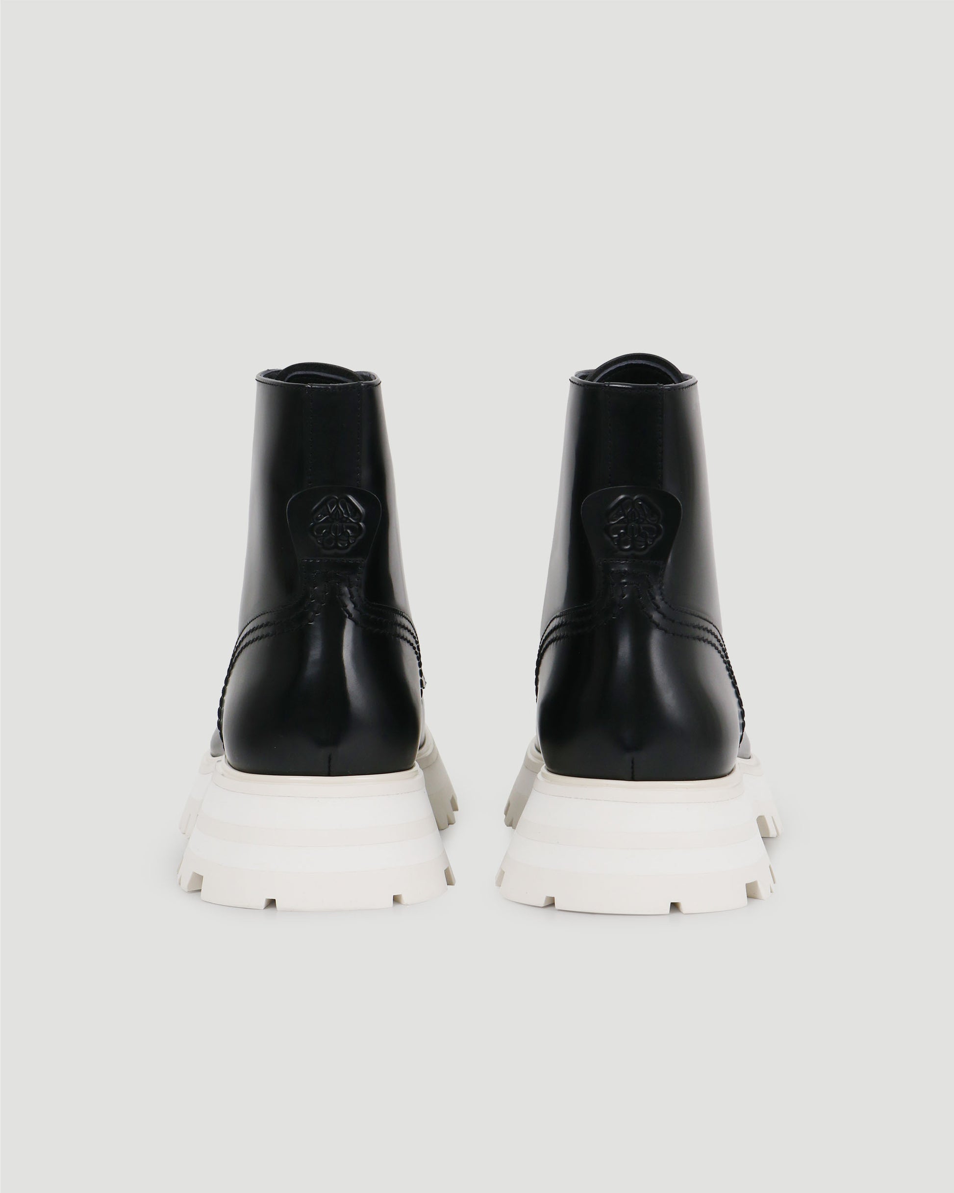 Made from shiny spazzolato calf leather in black, this pair of lace-up boots are finished top-stitch detailing and exaggerated flared rubbed lug sole in ecru. Featuring round toe shape, Alexander McQueen signature on tongue, Alexander McQueen seal logo in high relief on the heel counter. Pair with knitted bodycon dress for a cozy look.