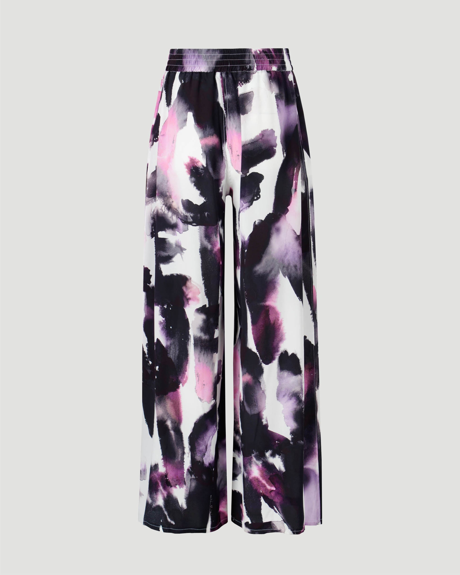 These trousers by Alexander McQueen combine comfort and luxury in one. With a pyjama pant silhouette, they feature a loose, relaxed fit, with an elasticated waist. Crafted from silk in a watercolor print with shades of purple and black.