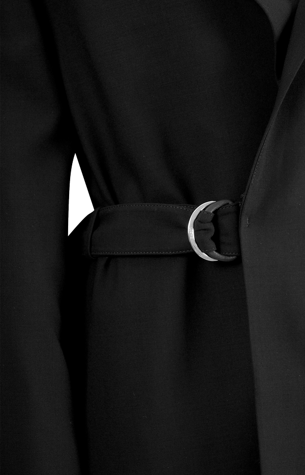 This Wool Blazer with Belt by Loewe is crafted from wool with viscose lining. It features an elongated silhouette, straight shoulders, wide lapels, three-button cuffs, and asymmetrical belt with metal D-ring buckle.
